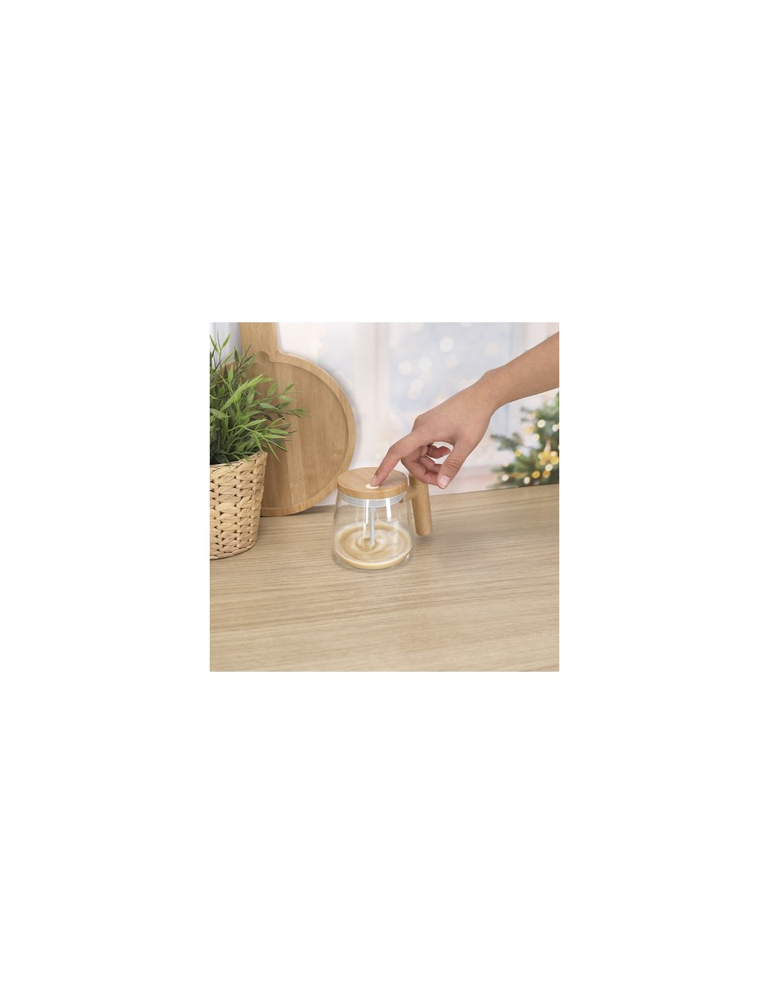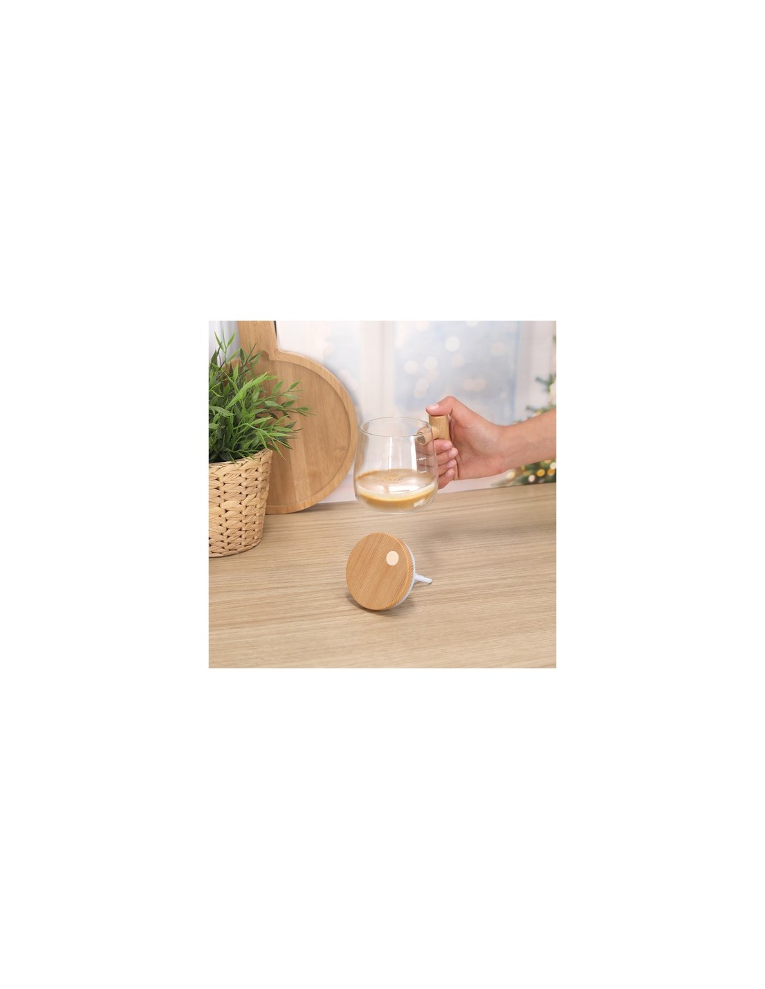Taza mezcladora fabricada en resistente cristal de borosilicato de 400ml de capacidad. Incluye tapadera con agitador eléctrico alimentado por 2 pilas AAA (no incluidas) y botón de on/off en la parte superior. Con compartimento en mango especial para guardar el agitador, fabricados en ABS imitación madera. Además, tiene escala de medidas impresa en el cuerpo de color blanco.Fabricado en cristal de borosilicato, que ofrece una resistencia y durabilidad excepcionales, alargando su vida útil y pudiendo ser reutilizado infinidad de veces. 400 ml. 2 Pilas AAA No Incluidas Composition : Cristal Borosilicato/ ABS.