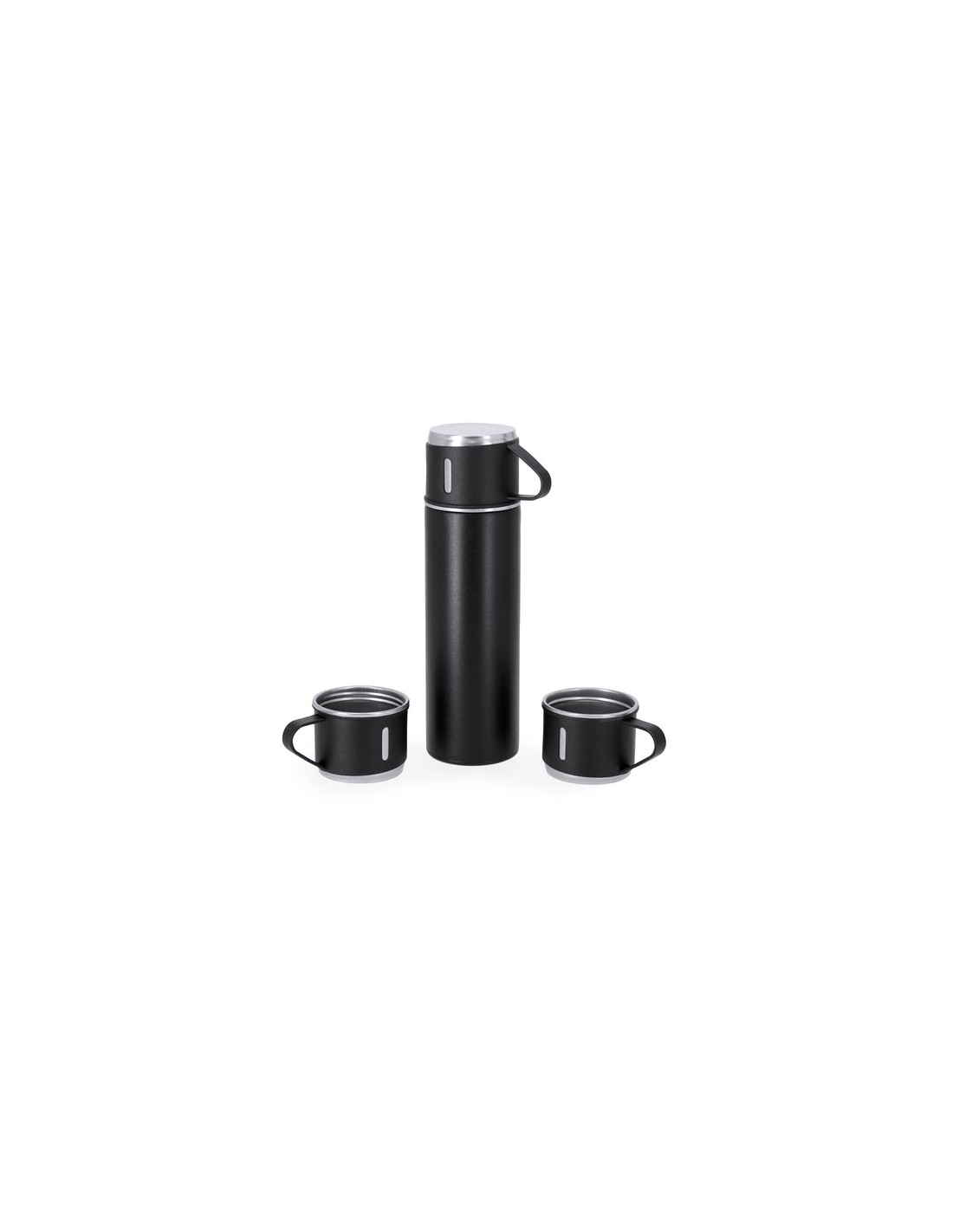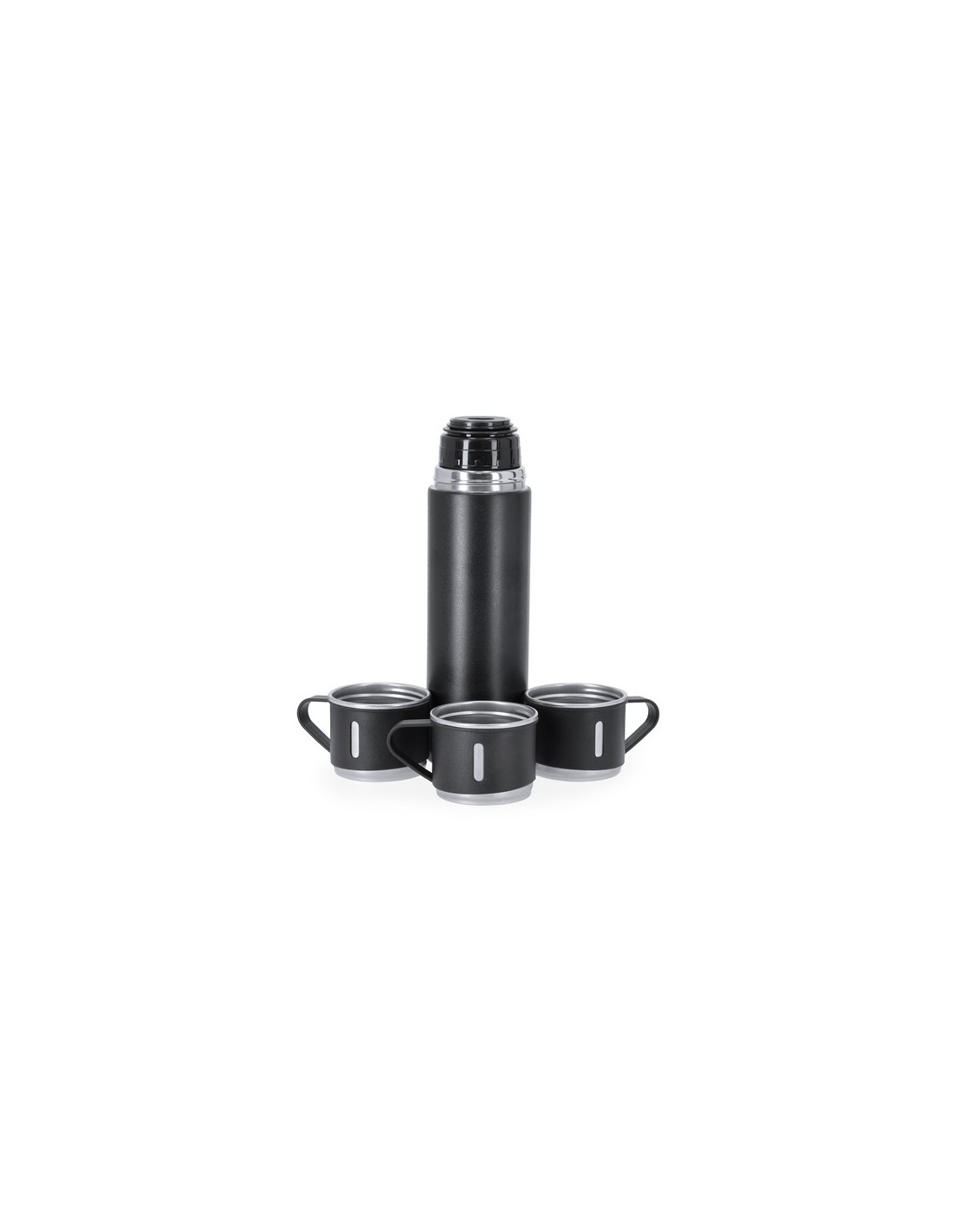 Set de termo con 3 tazas fabricado en acero inox. Termo de 420 ml de capacidad y de doble pared, que garantiza una mejor y más duradera conservación de la temperatura, con dosificador de seguridad. Tazas de 140ml, ajustables mediante rosca y en elegante diseño negro, ideales para disfrutar de la bebida, ya sea caliente o fría, en cualquier momento y lugar. Presentación en elegante estuche de color negro. Termo 420 ml. 3 Tazas 140 ml Composition : Acero Inox.