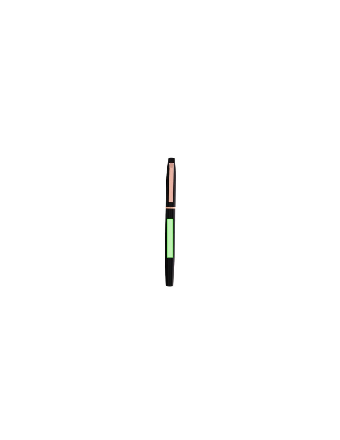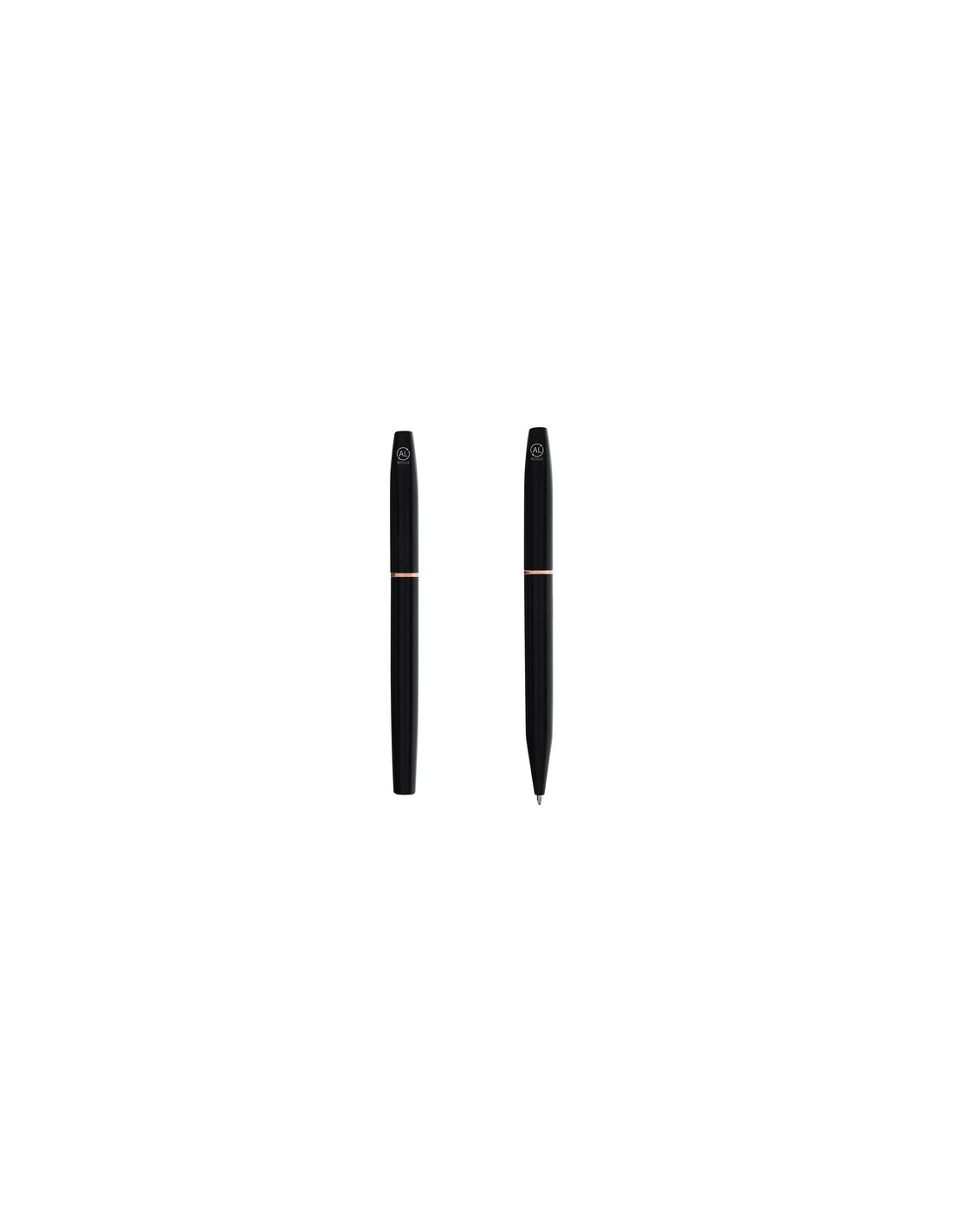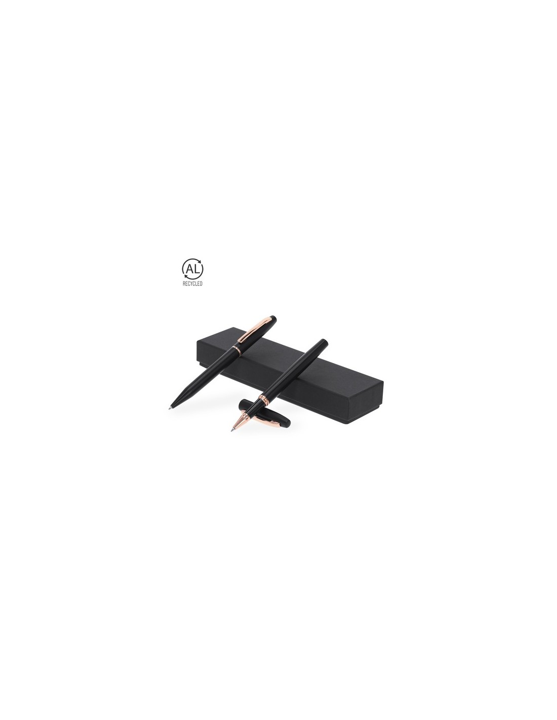 Set de bolígrafo y roller fabricados en Aluminio Reciclado, en elegante diseño negro mate con distinguidos accesorios en acabado oro rosa. Bolígrafo de mecanismo giratorio y roller con capucha, ambos con clip metálico. En tinta azul y logotipo de Aluminio Reciclado. Presentación en elegante estuche negro.El Aluminio Reciclado es un material con posibilidades de reciclaje casi infinitas, sin perder sus propiedades originales y consumiendo menos energía en este proceso.Certificación GRS (Global Recycled Standard / Estándar de Reciclaje Global), que garantiza el origen reciclado del material usado para fabricar el producto. Bolígrafo y Roller Composition : Aluminio Reciclado.