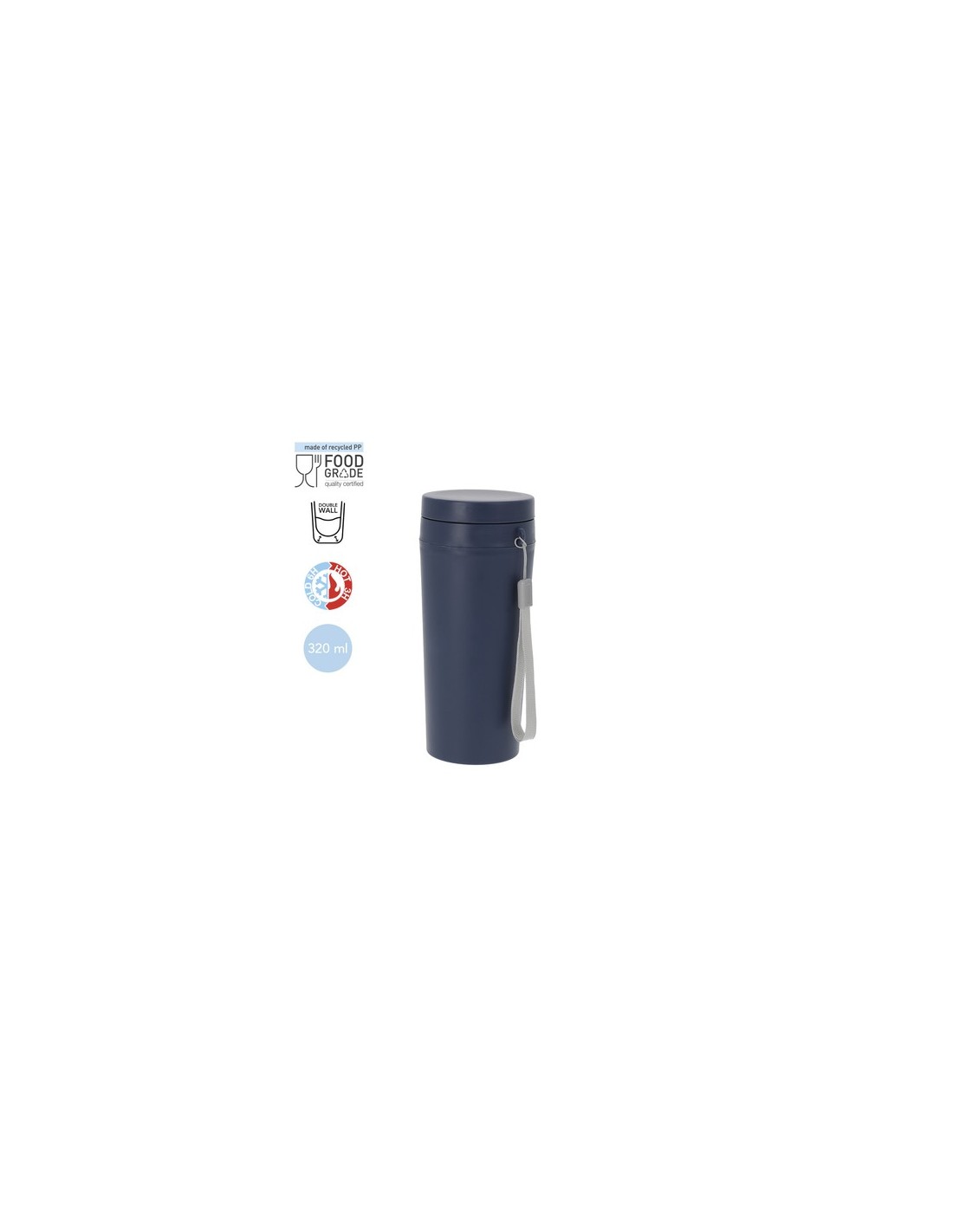 Bidón térmico fabricado en resistente PP Reciclado, con 320ml de capacidad. Con tapón de cierre hermético a rosca y cinta de transporte en color gris. El PP reciclado es un plástico reciclado y altamente reciclable, de gran resistencia y apto para multitud de aplicaciones. 320 ml Composition : PP Reciclado.