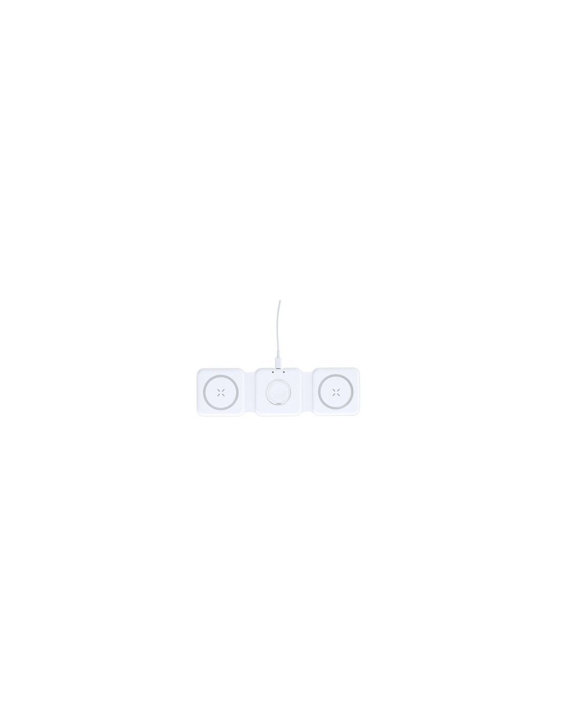 Completo cargador inalámbrico magnético 15W, diseñado para la carga simultánea del smartphone, auriculares y smartwatch. Un gadget todo en uno: plegable, portátil, de tamaño compacto, muy versátil y de diseño funcional. Conexión por usb Tipo C -cable incluido- y elaborado en resistente ABS de color blanco. Fabricado conforme a los estándares RoHS y en cumplimiento con los siguientes requisitos de seguridad:Sistema de protección contra sobrecalentamiento.Sistema de protección contra sobrecarga.Sistema de bloqueo para evitar cortocircuitos. Inalámbrico 15W. Magnético