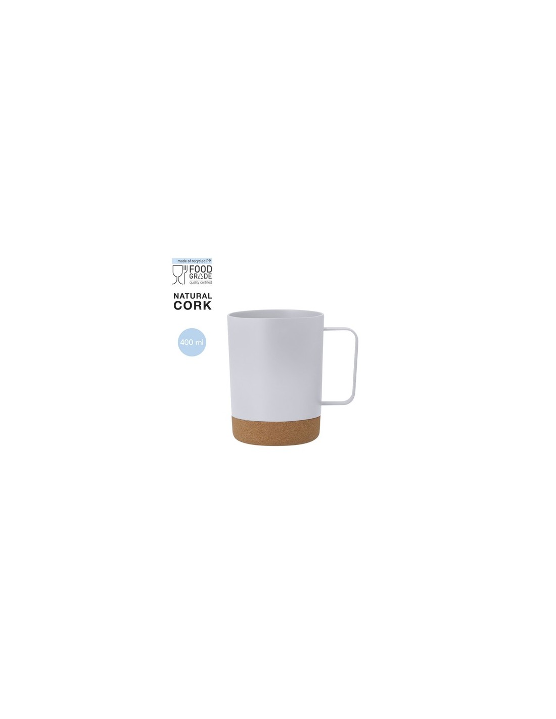 Taza fabricada en resistente PP Reciclado y corcho natural. Con 400 ml de capacidad. Distinguido diseño con original asa cuadrada. El PP reciclado es un plástico reciclado y altamente reciclable, de gran resistencia y apto para multitud de aplicaciones. 400 ml Composition : PP Reciclado/ Corcho.