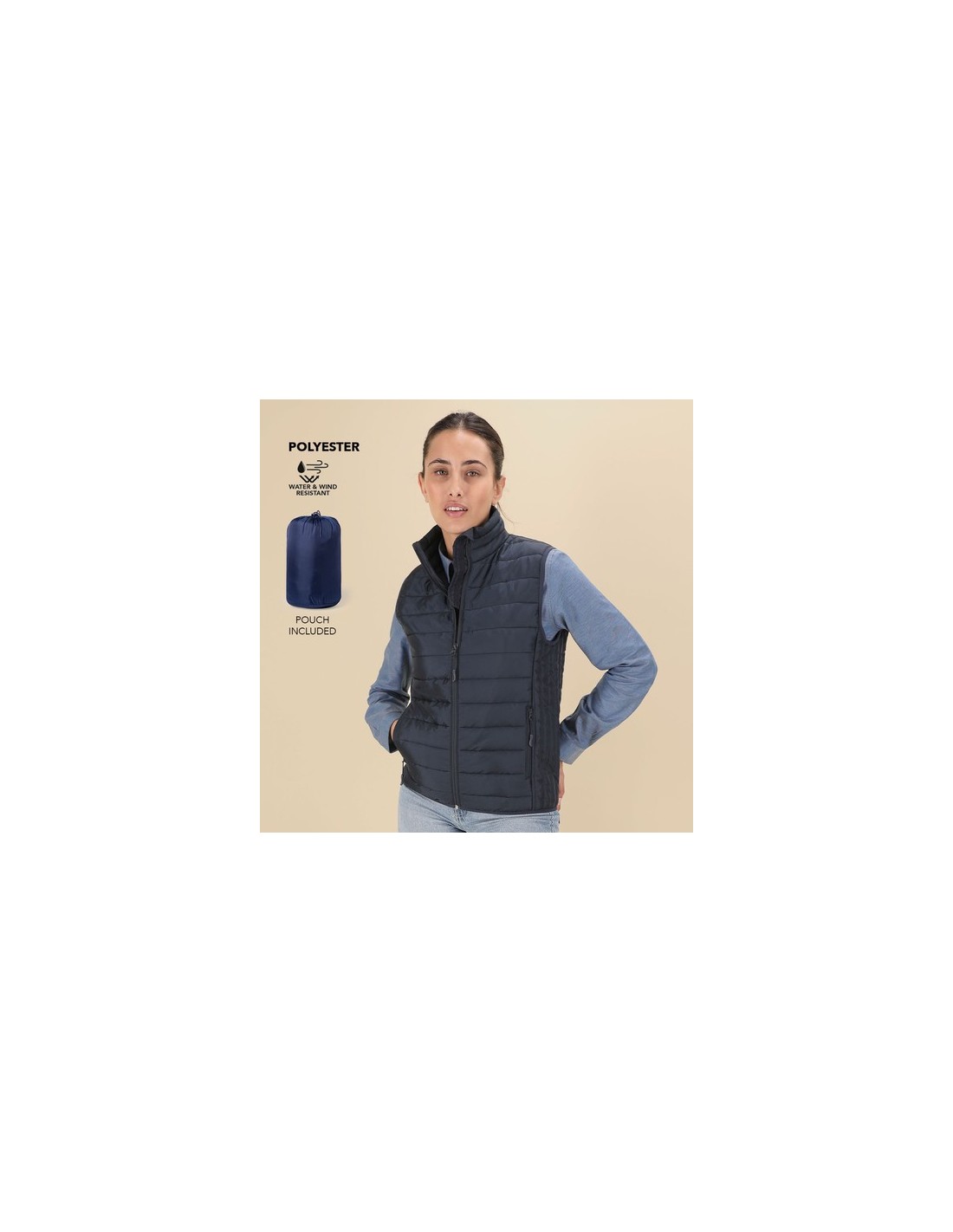 Chaleco acolchado de mujer en material extra ligero, compacto y de corte entallado. Resistente al agua y cortavientos, con suave relleno y forro interior. Cierre de cremallera invertida y tirador a juego. Cuenta con 2 bolsillos laterales con cremalleras y tirador a juego y 2 bolsillos interiores. Sisa y cintura con ribete elástico a tono. Incluye práctica funda de transporte. Resistente al Viento y al Agua. Funda Poliéster Composition : 100% Poliéster.