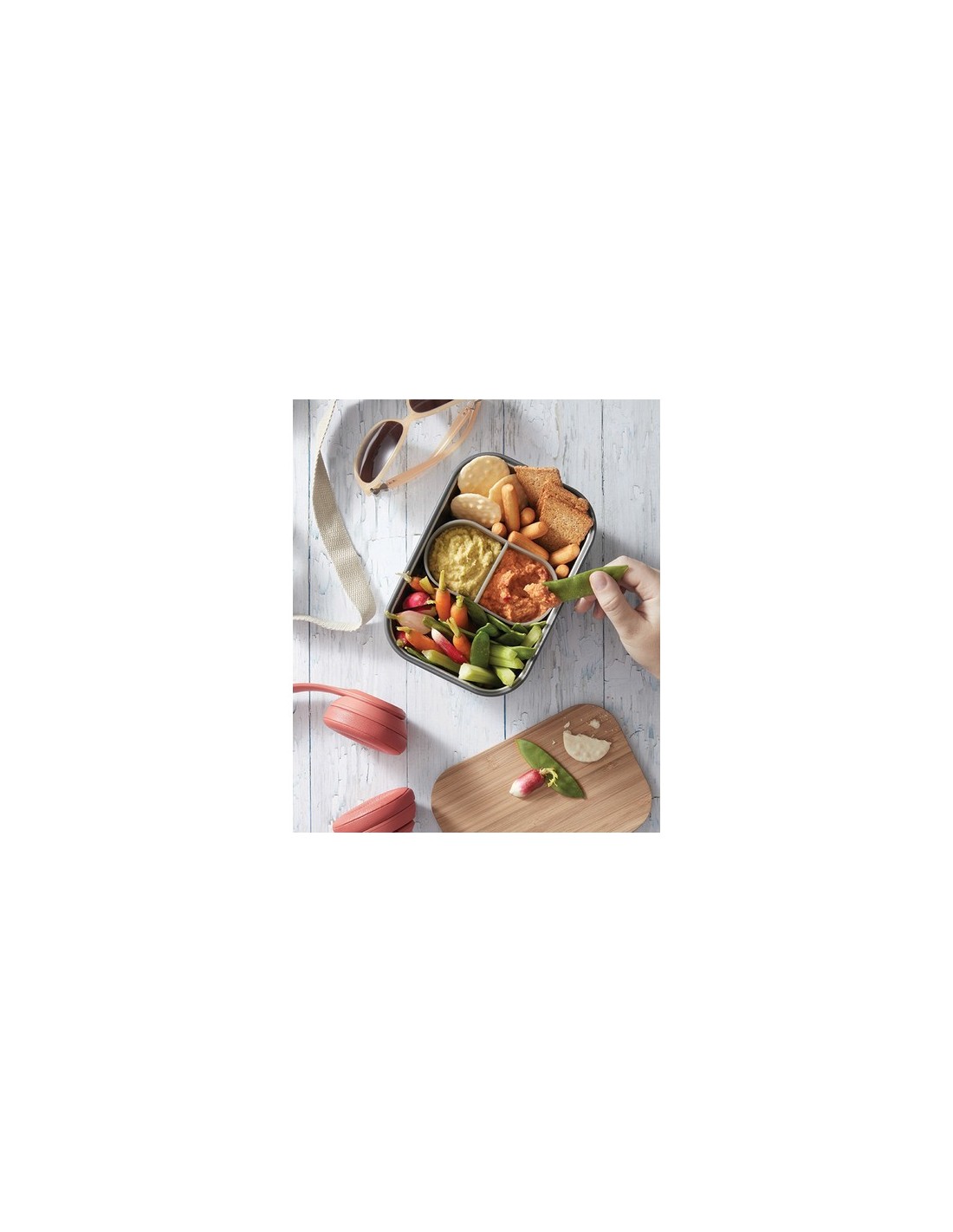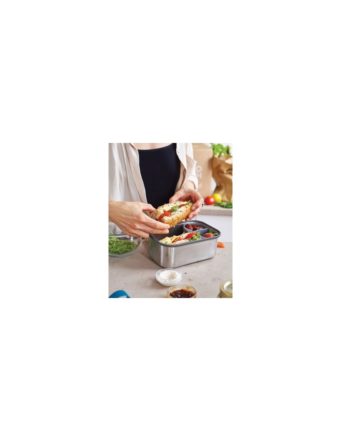 Basándonos en el éxito de nuestra primera fiambrera, hemos introducido esta versión más profunda para permitirle llevar consigo artículos más grandes, como frutas y yogures. Esta es una solución de diseño robusta y 100% libre de plástico para preparar y transportar tus sándwiches, embutidos o incluso tu selección de quesos! Esta fiambrera de acero inoxidable es uno de esos productos que resulta familiar y confiable desde el primer día, y está diseñado para envejecer maravillosamente. Utiliza la tapa de bambú naturalmente antibacteriana como tabla de cortar para crear tus sándwiches o como tabla para servir para reunir los ingredientes para una comida deliciosa más tarde durante el día. La caja de acero inoxidable protege el contenido y la correa de silicona proporciona mayor seguridad. El compartimento interior te ayuda a separar diferentes alimentos y es apto para microondas. Lavar a mano únicamente. Material : Acero inoxidable, Bambú Recycled Content Percent : 0 Sin materiales Bisphenol A, Conforme directiva seguridad Alimentos 1935/2004/EC & 2020/1245, Restringido en el Convenio de Estocolmo, Reglamento PoP UE/Reino Unido, Reglamento REACH (CE) nº 1907/2006, flúor total menos de 50 ppm Packaging : Caja de regalo All print codes : CO2 Engraving 2,Pad Print,Laser Engraving 2 - Print code default : Grabado CO2 - parte superior - 90 x 60 mm - max color : 1 Social Audits : BSCI Total CO2 emissions : 3,08.