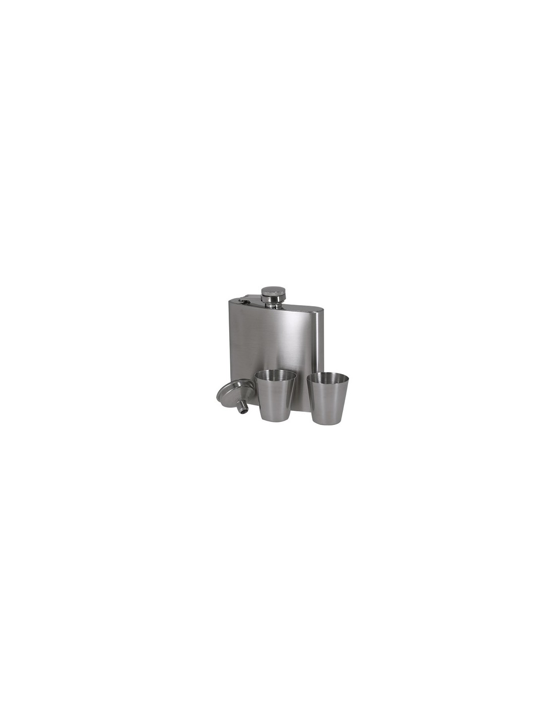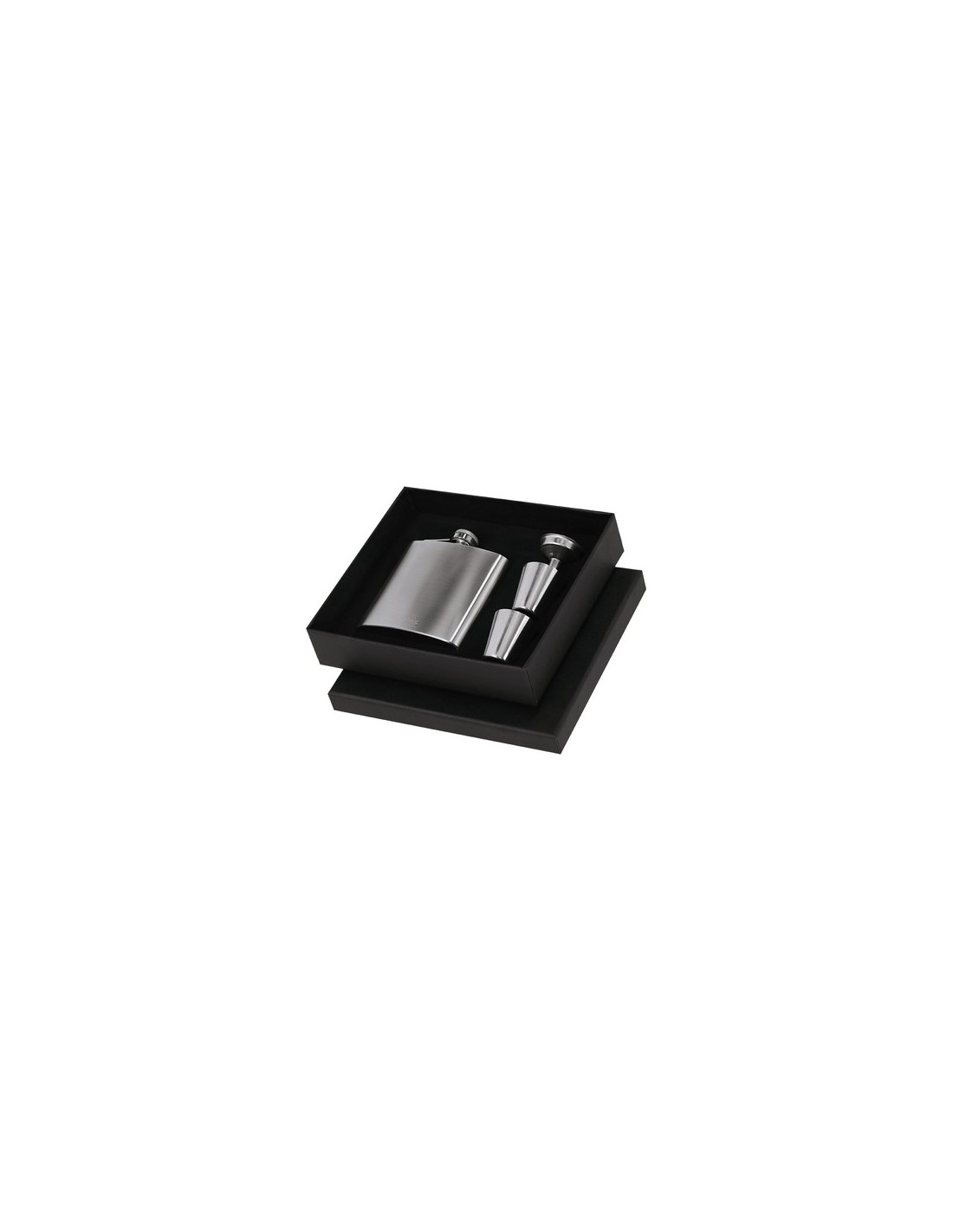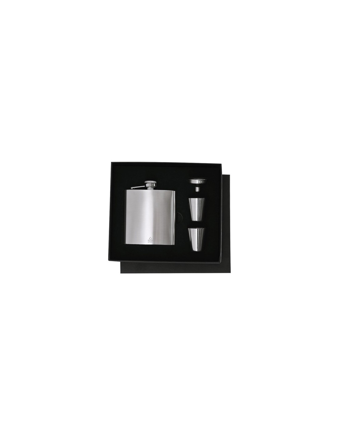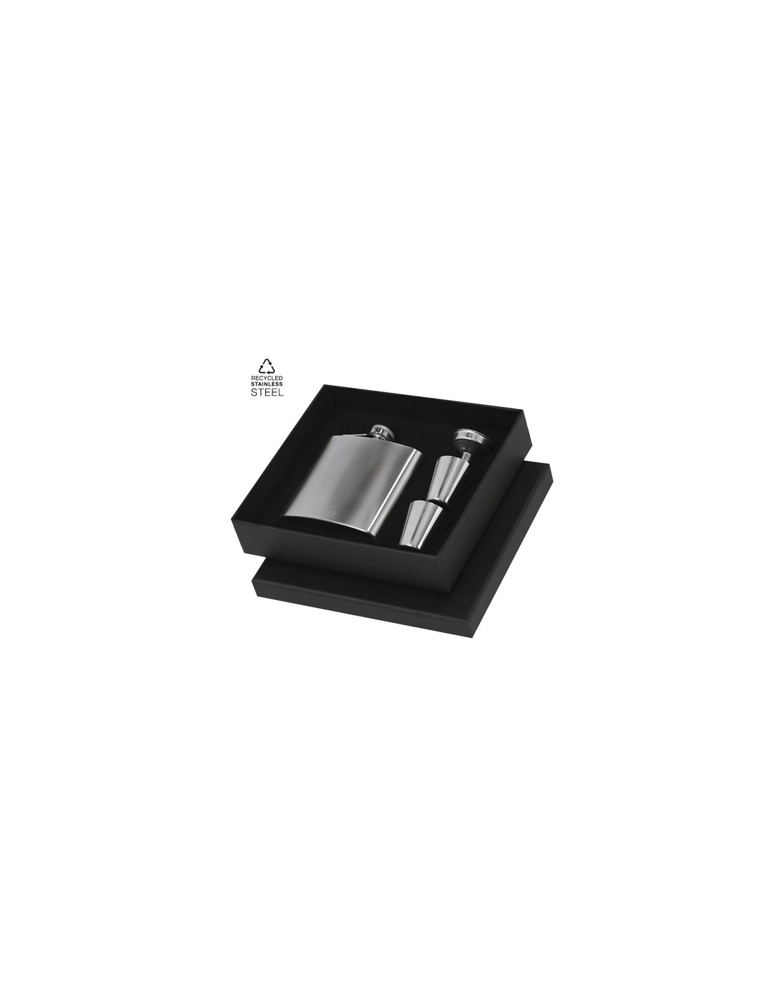 Set de Petaca con Accesorios en Acero Inoxidable Reciclado. Incluye:- Petaca de 175 ml con sistema antigoteo y cierre de rosca para un almacenamiento seguro y sin derrames.- Dos vasos medidores de 30 ml de capacidad.- Embudo de dosificación, que facilita el llenado.Incluye distintivo de Acero Inox Reciclado. Prresentado en caja negra.El acero es uno de los materiales más demandados y que puede encontrarse casi en todas partes, desde productos de uso diario a grandes construcciones. Con innumerables propiedades, entre las que cabe destacar la durabilidad y su alto grado de reutilización, convirtiéndolo en una alternativa muy valorada en soluciones de sostenibilidad. Debidamente tratado, permite obtener nuevos recursos de infinita utilización. 175 ml. 4 Accesorios Composition : Acero Inox Reciclado.