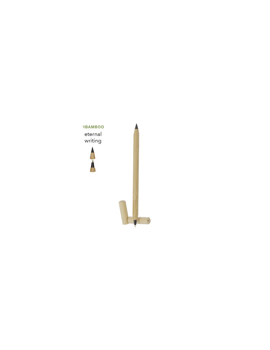 Bolígrafo lápiz eterno 2 en 1 fabricado en bambú. Dispone de un doble cierre de capucha en cartón reciclado. En un extremo, cuenta con un bolígrafo con tinta azul; en el otro, un lápiz eterno que permite escribir de forma continua sin necesidad de reemplazo.Materiales como el Bambú fomentan la utilización de materias primas naturales reduciendo las emisiones contaminantes. Además, el bambú proviene de una planta de gran resistencia y versatilidad, con crecimiento y regeneración rápida, siendo una excelente alternativa al uso de madera tradicional. Composition : Bambú.