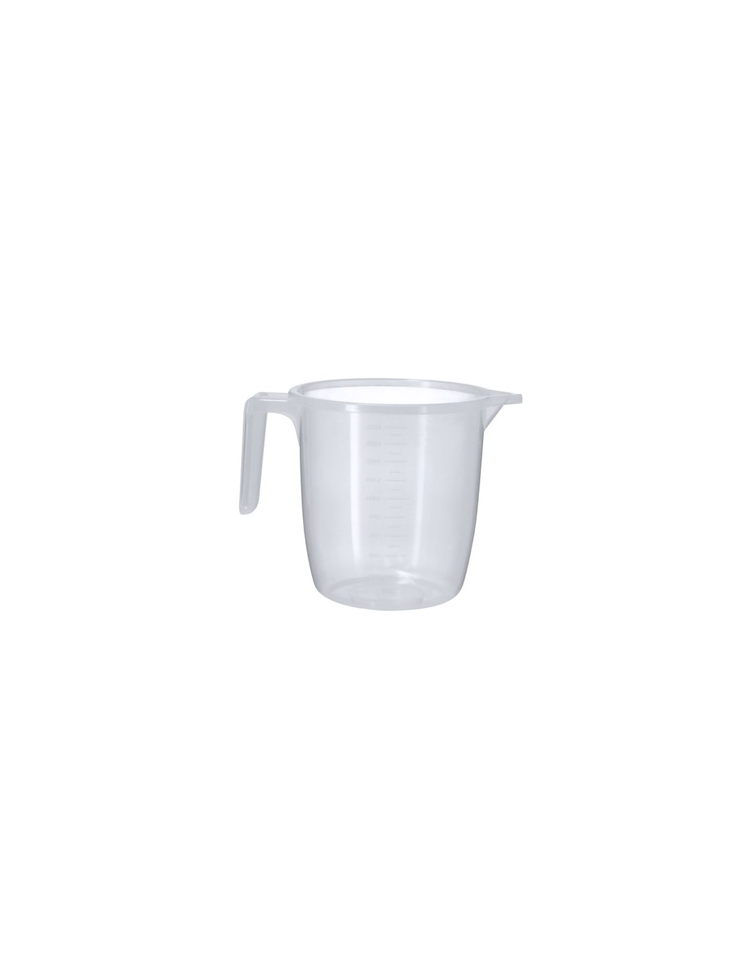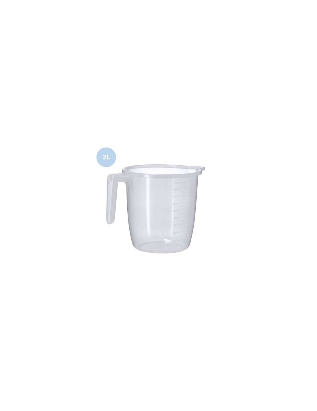 Jarra medidora de 2L fabricada en resistente PP transparente con asa. Con medidor lateral en tramos de 200 ml y 100 ml. Incluye vertedor en el borde para evitar derrames. 2 L Composition : PP.
