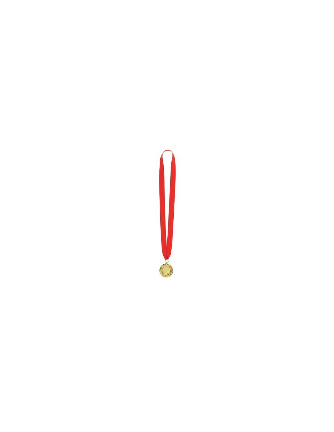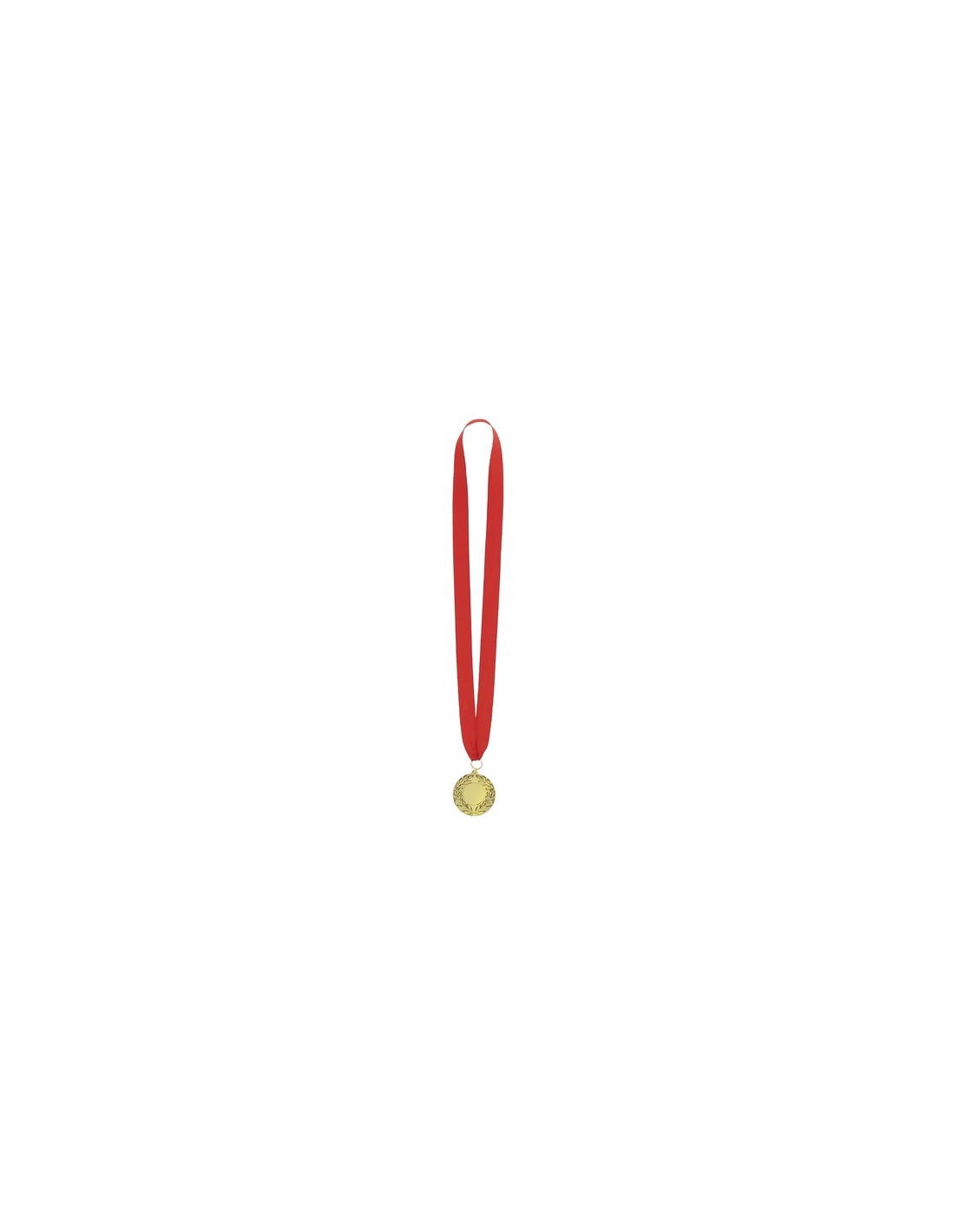 Medalla metálica de acabado dorado en relieve. Incluye cinta de poliéster en rojo. Composition : Metal.
