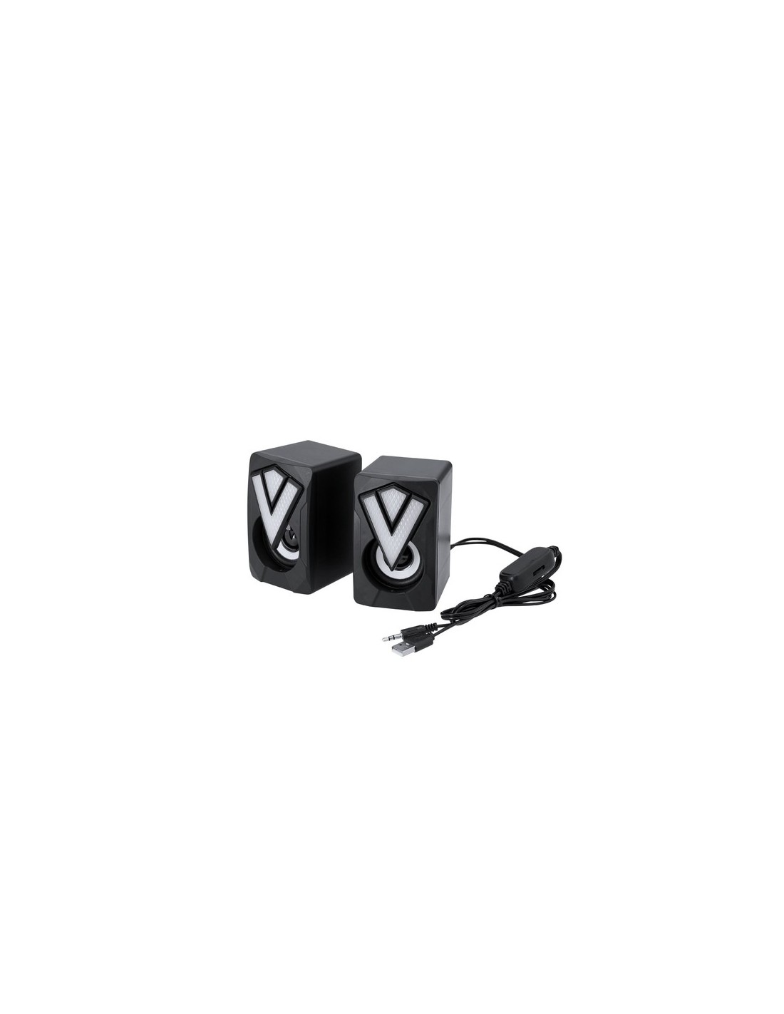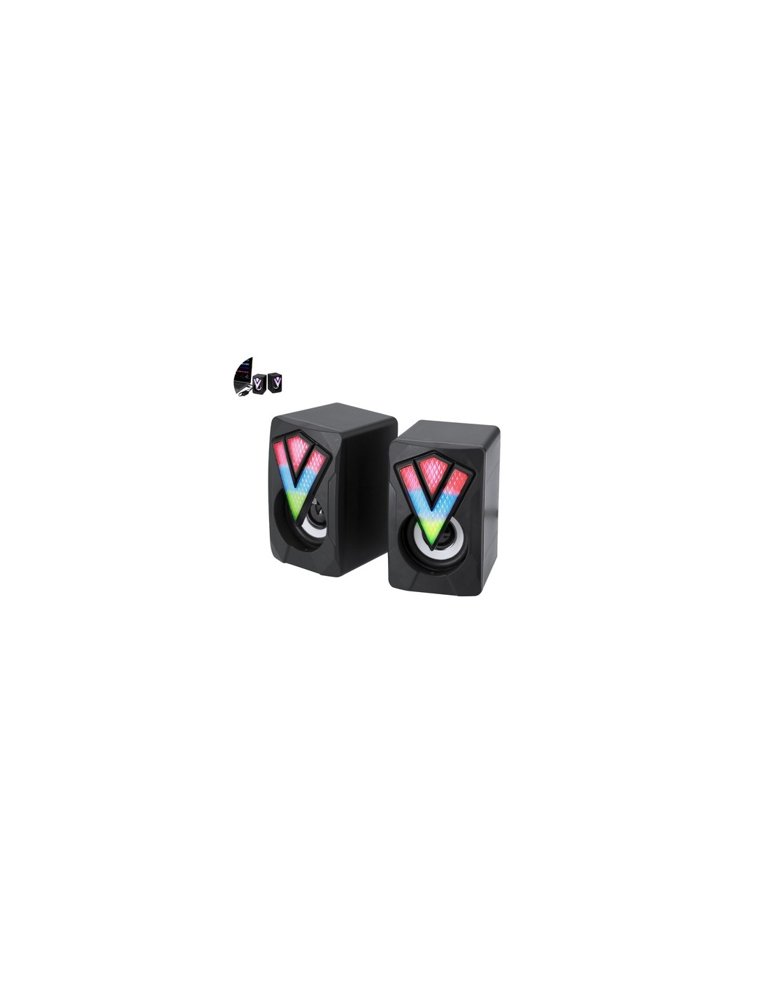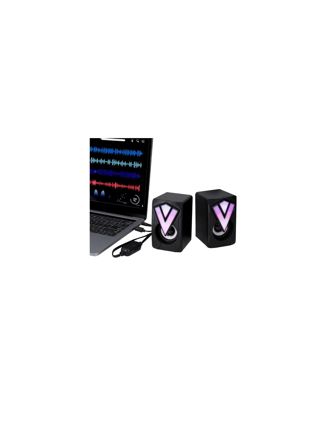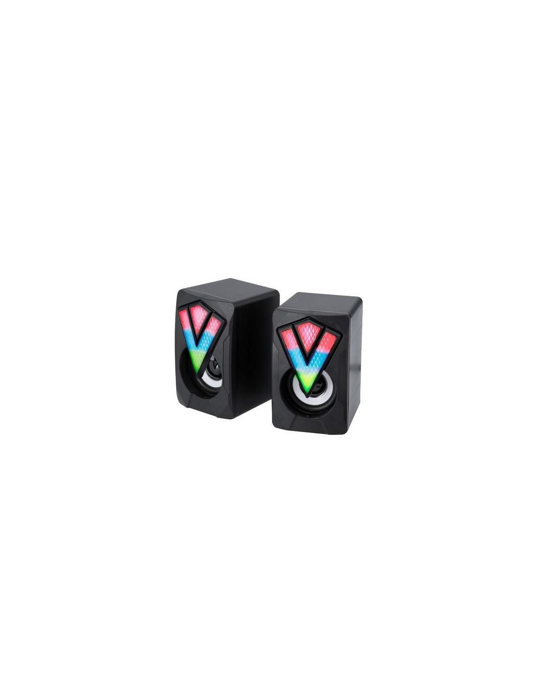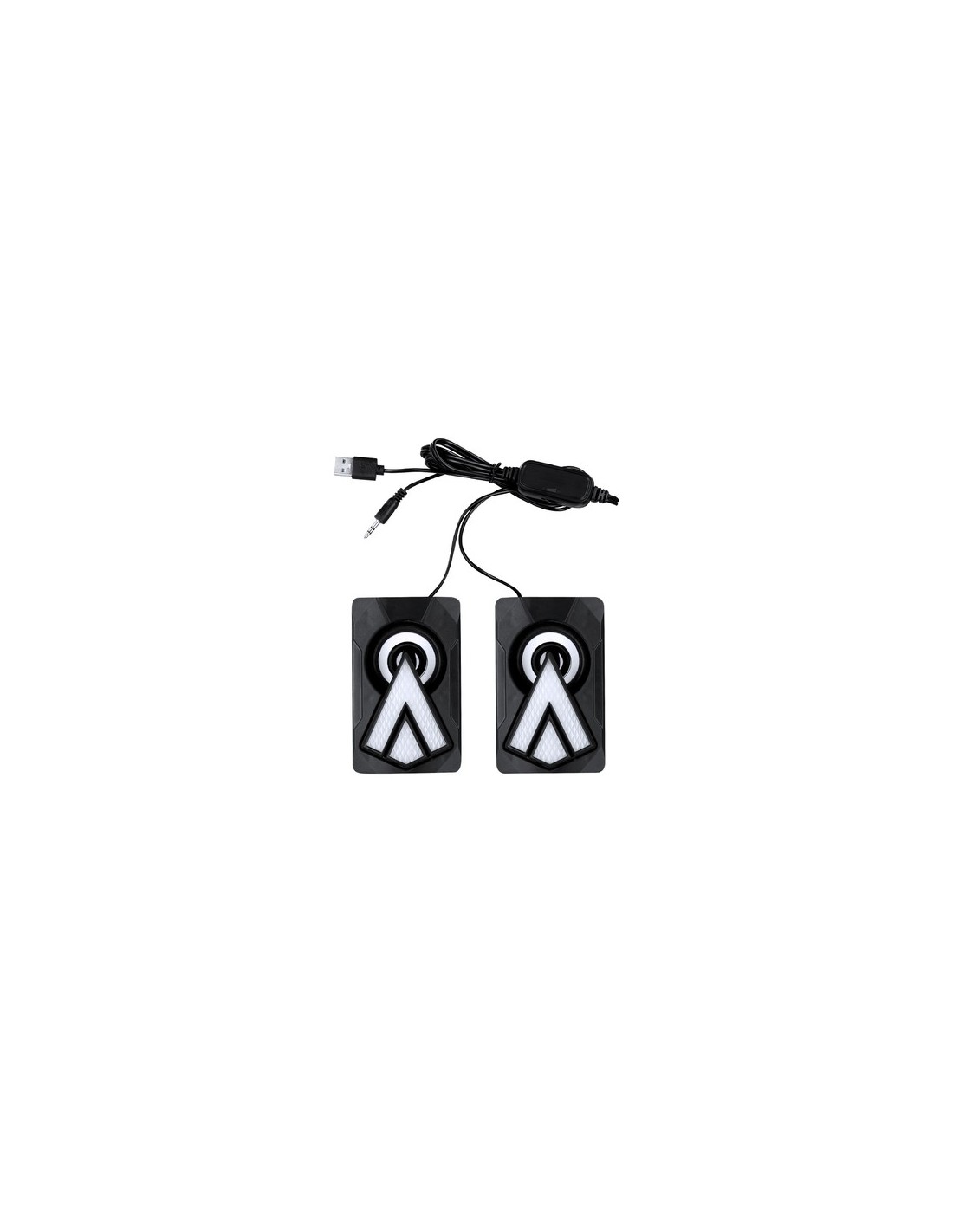 Altavoces gamer diseñados para una experiencia de juego inmersiva. Diseñados con carcasa en negro mate con luces LEDs multicolor y efectos de iluminación automáticos. Incluyen un cable integrado con regulador de volumen, conexión jack de 3,5 mm y alimentación a través de USB. Luces Led Multicolor. Potencia Sonido 3W. Conexión Jack 3,5 mm y USB