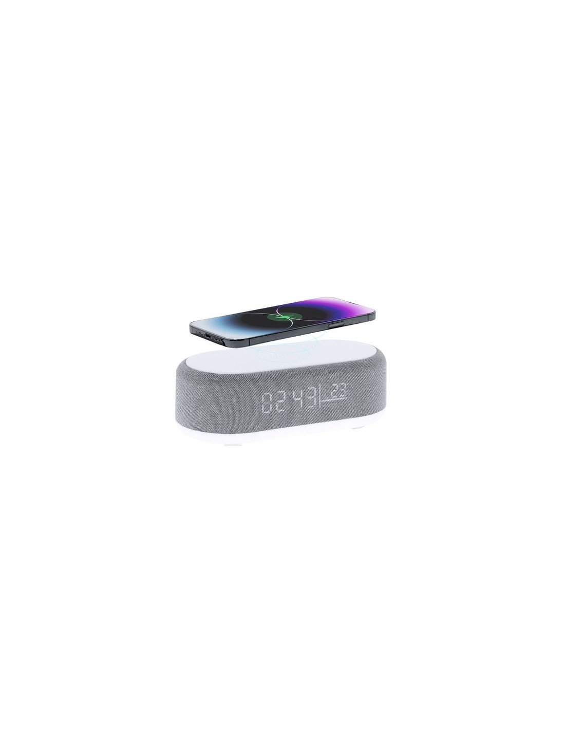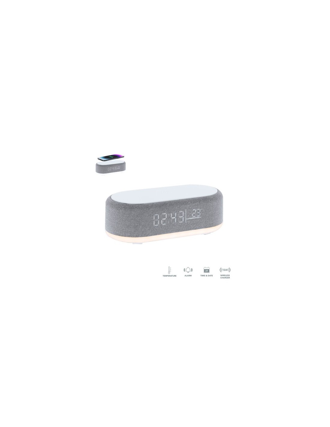 Reloj multifunción 5 en 1. Incluye múltiples funciones:-Cargador inalámbrico de 15W- Lámpara con luz cálida e intensidad regulable, ideal para crear ambientes agradables- Altavoz de 5W- Función hora (12/24h) y alarma- Indicador de temperatura y fechaCon pantalla retroiluminada y batería de 1200 mAh. Compatible con dispositivos equipados con tecnología de carga inalámbrica Qi. Fabricado en ABS blanco en combinación de poliéster. Con entrada USB Tipo C -cable incluido -. Lámpara 26 Ledes. Intensidad de Luz Regulable. Altavoz Conexión Bluetooth. Potencia Sonido 5W. Batería 1200 mAh. Cargador Inalámbrico 15W Composition : Poliéster/ ABS.