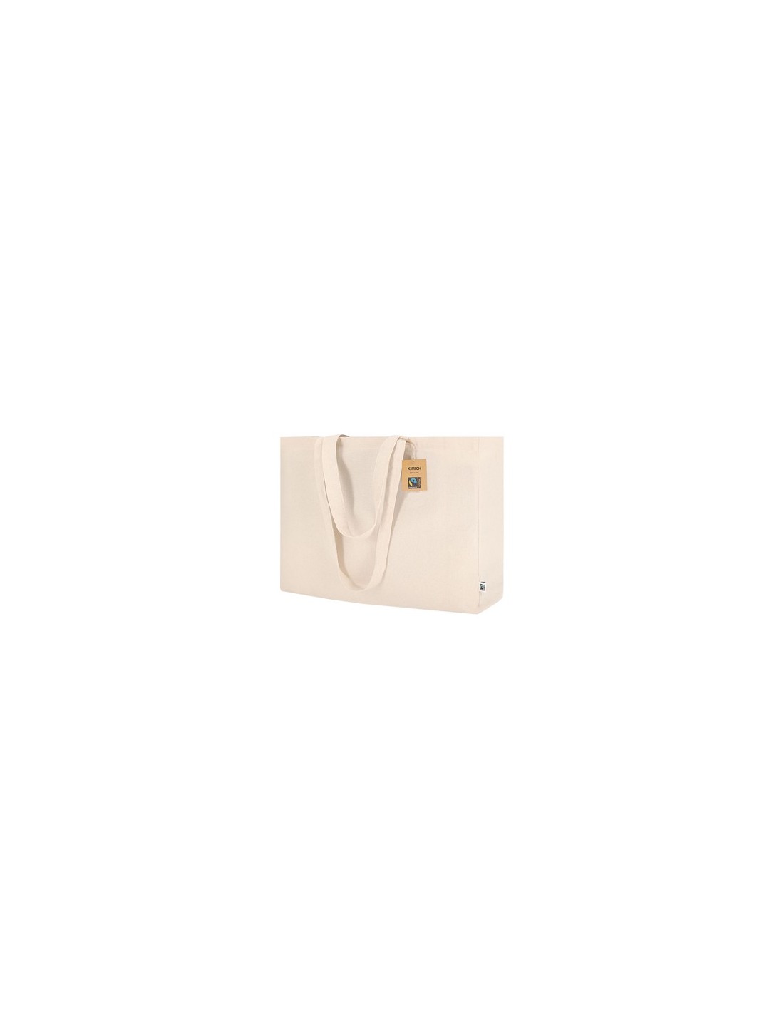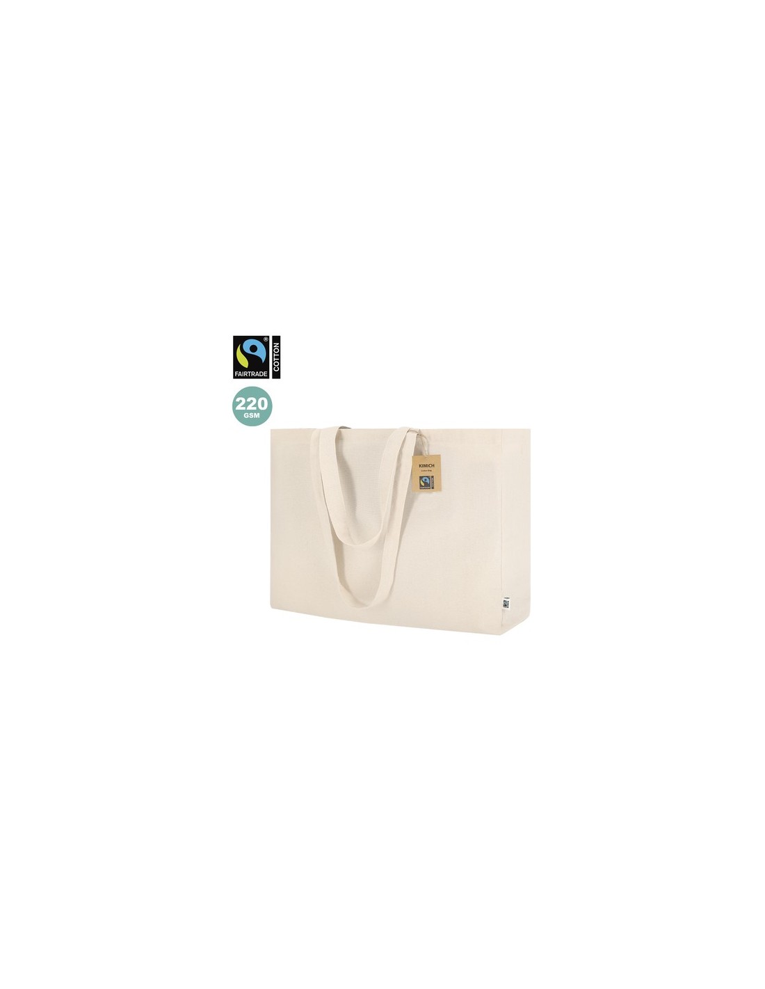Bolsa confeccionada principalmente en algodón de 220g/m2. Con certificación Fairtrade (Comercio Justo) un sistema comercial solidario y alternativo al convencional que persigue el desarrollo de los pueblos y la lucha contra la pobreza. De acabado cosido con fuelle, asas largas reforzadas de 70cm y resistencia hasta 10kg de peso. Incluida etiqueta Fairtrade y hangtag distintivo en cartón reciclado. Composition : Algodón 220 g/ m2.