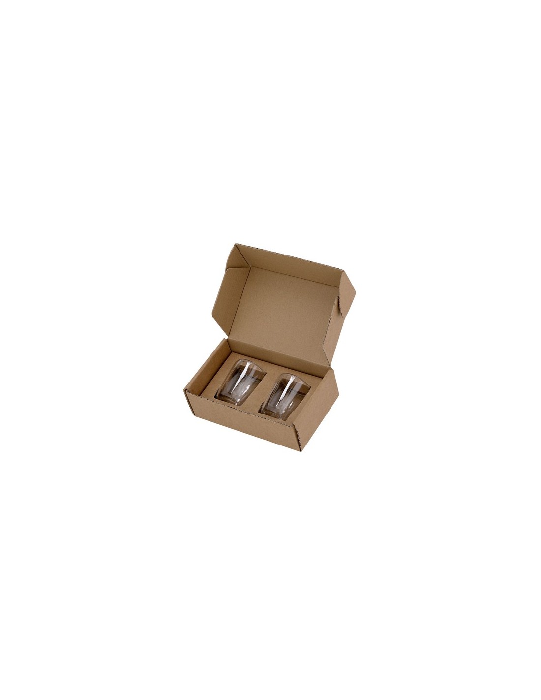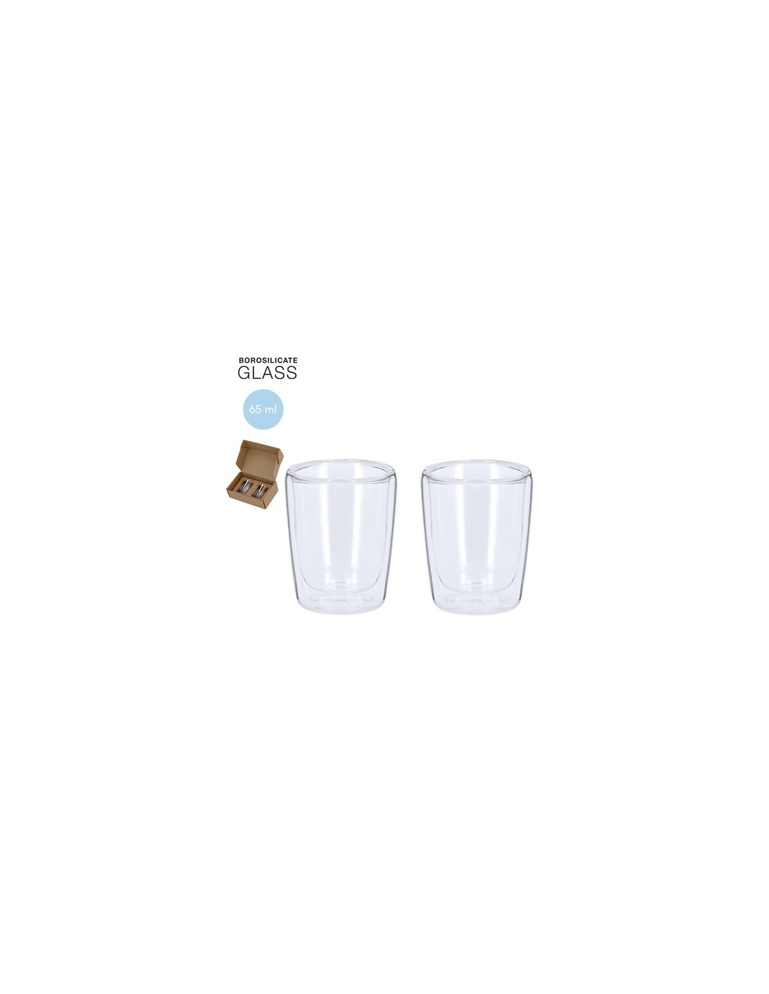 Elegante set de vasos de cristal de borosilicato de doble pared. Incluye dos vasos, cada uno con una capacidad de 65 ml. Presentados en una caja troquelada. 2 Piezas. 65 ml Composition : Cristal Borosilicato.