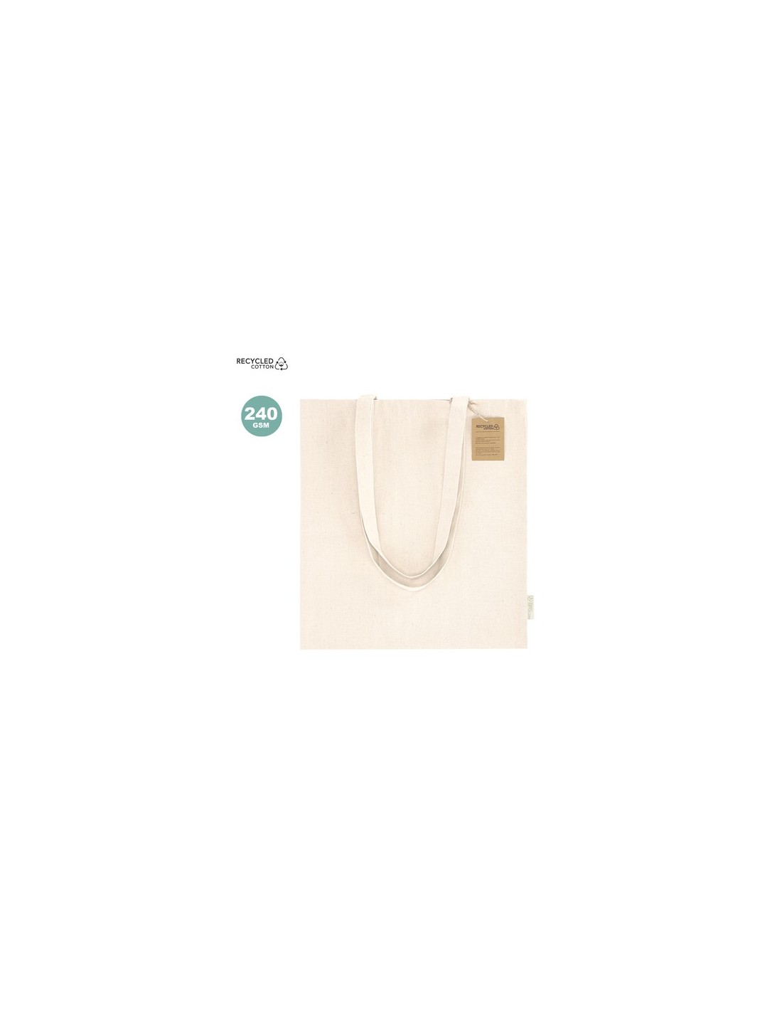Bolsa confeccionada principalmente en algodón reciclado de 240 g/m2. Asas largas de 70cm con refuerzo, de acabado cosido. Logotipo en etiqueta lateral y resistencia hasta 7 kg de peso. Composition : Algodón Reciclado 240 g/ m2.