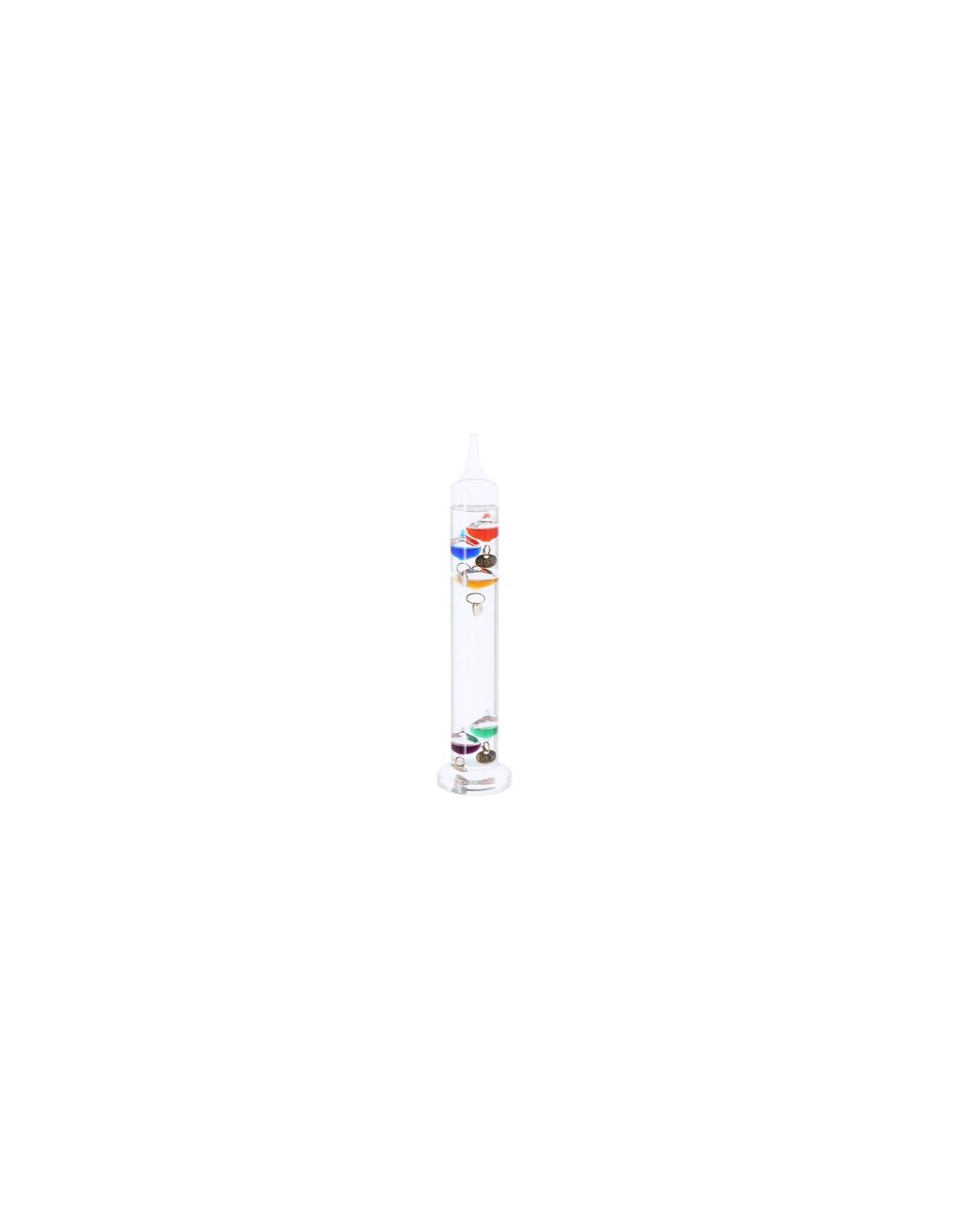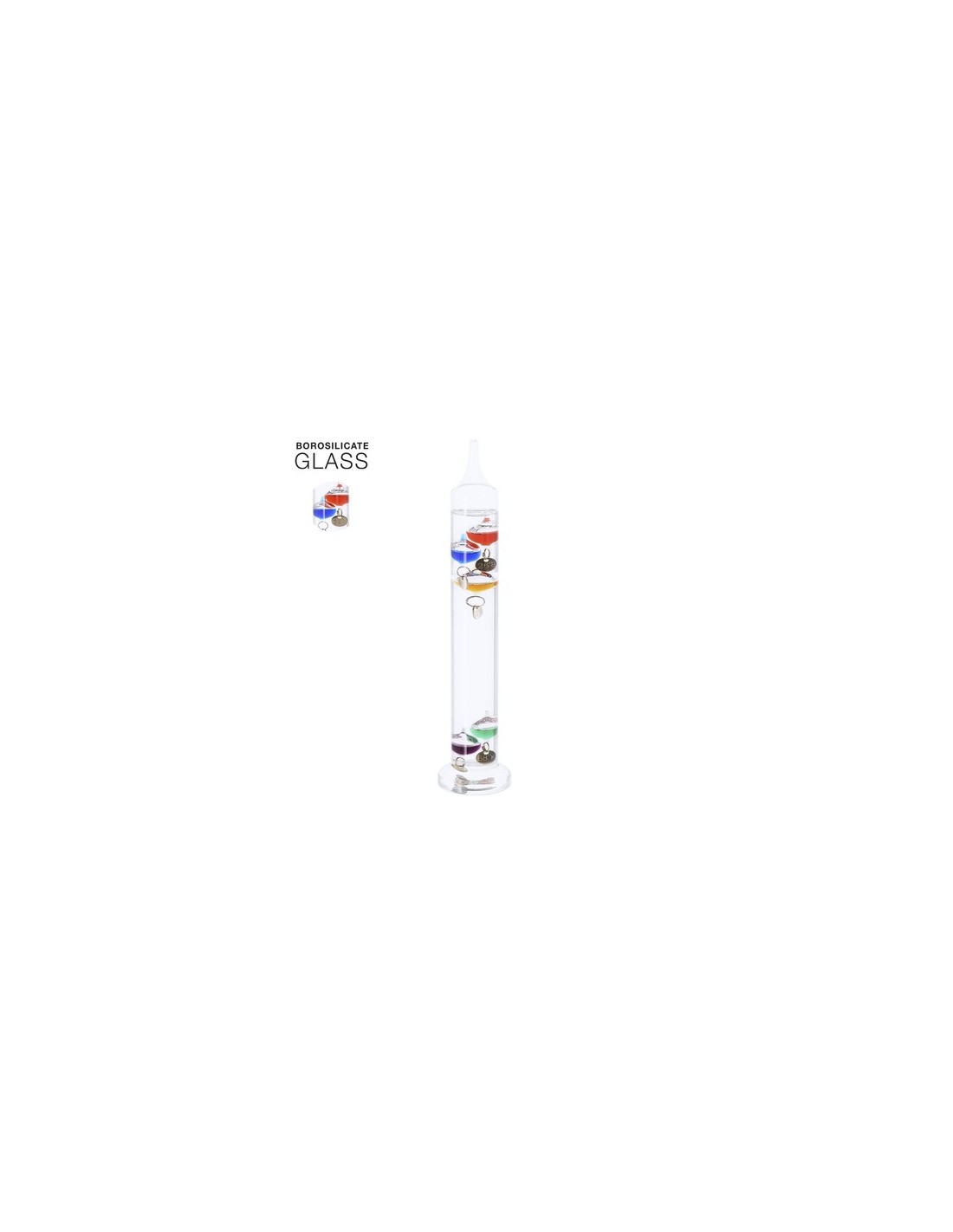 Termómetro Galileo en vidrio de borosilicato de diseño elegante y compacto. Con 5 ampollas de vidrio de colores (morado, verde, naranja, azul y rojo) que indican temperaturas en °C y °F mediante etiquetas doradas, las cuales se mueven por el termómetro en función de la temperatura del exterior. Composition : Cristal Borosilicato.