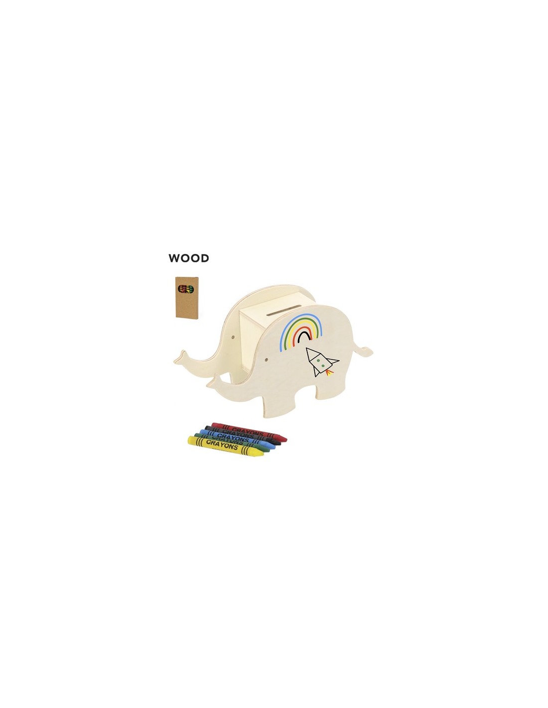 Hucha fabricada en madera natural con diseño de animales. Incluye ceras de colores que permite personalizar el diseño de cada hucha. Incorpora práctico agujero inferior para acceder fácilmente a los ahorros sin necesidad de romperla. 5 Ceras Incluidas Composition : Madera.