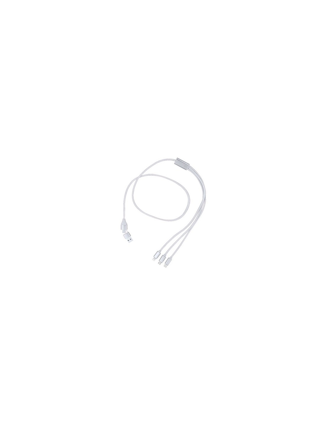 Cable cargador en Aluminio Reciclado. Con conexión de entrada dual Tipo C/USB y salidas Tipo C, Lightning y Micro USB. Incluye distintivo Aluminio Reciclado.El Aluminio Reciclado es un material con posibilidades de reciclaje casi infinitas, sin perder sus propiedades originales y consumiendo menos energía en este proceso.Certificación GRS (Global Recycled Standard / Estándar de Reciclaje Global), que garantiza el origen reciclado del material usado para fabricar el producto.Conexión Micro USB, Tipo C y Lightning 5V DC 2.4A Conexión Micro USB, Tipo C y Lightning 5V DC 2.4A Composition : Aluminio Reciclado.