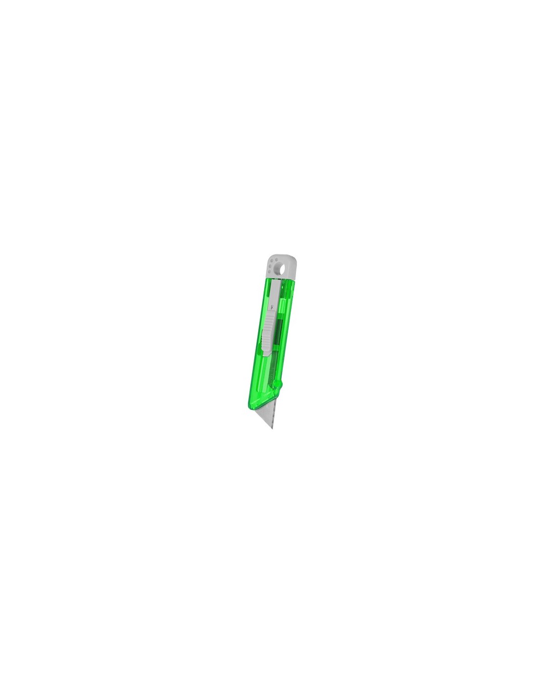 Cúter en PS de acabado translúcido. Con un mecanismo pulsador de retracción automática y una hoja de acero de 6 x 1,9 cm, sin sistema de bloqueo (stopper).