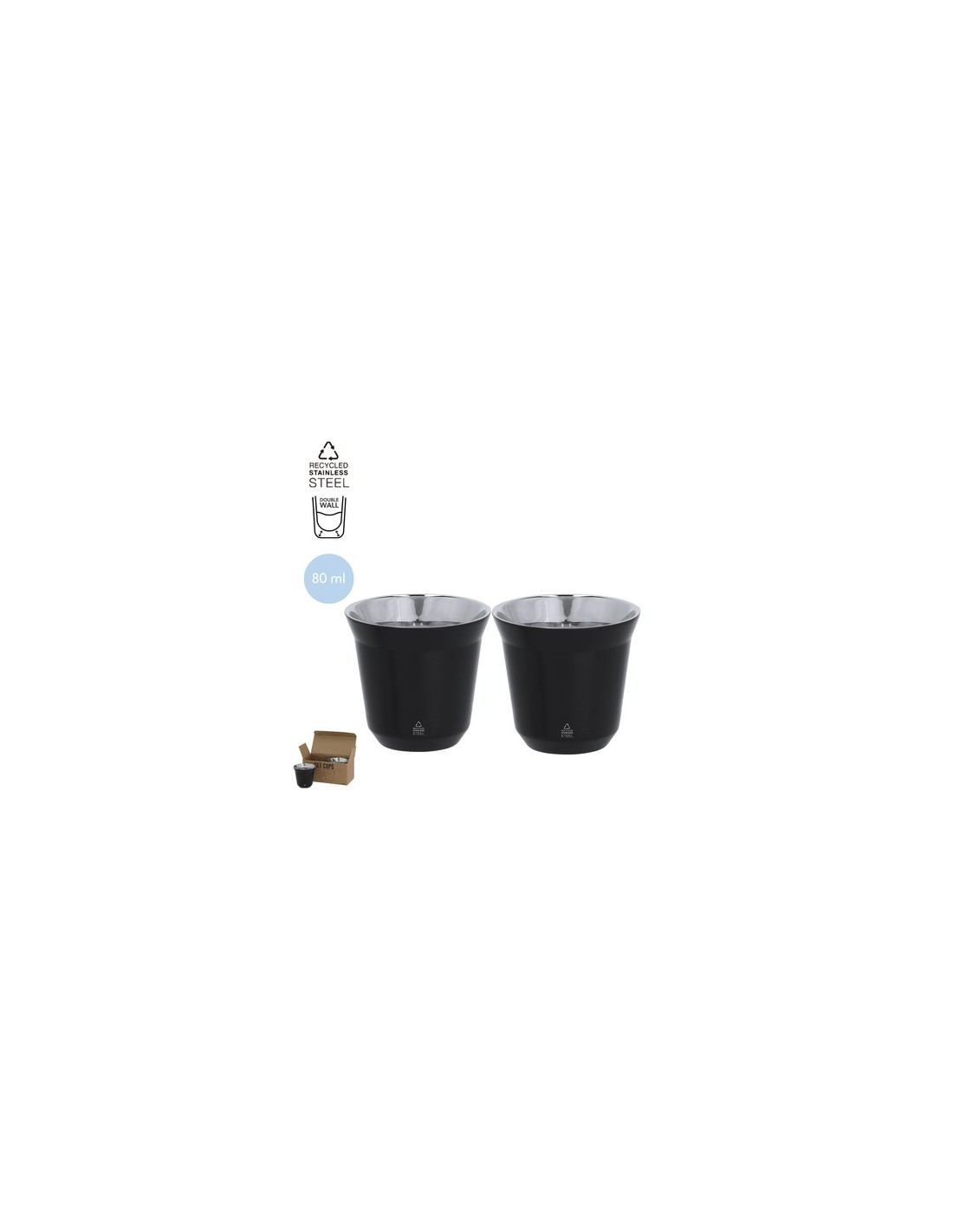 Elegante set de vasos de Acero Inox Reciclado de doble pared. Incluye dos vasos, cada uno con una capacidad de 80 ml. El acero es uno de los materiales más demandados y que puede encontrarse casi en todas partes, desde productos de uso diario a grandes construcciones. Con innumerables propiedades, entre las que cabe destacar la durabilidad y su alto grado de reutilización, convirtiéndolo en una alternativa muy valorada en soluciones de sostenibilidad. Debidamente tratado, permite obtener nuevos recursos de infinita utilización. 2 Piezas 80 ml Composition : Acero Inox Reciclado.