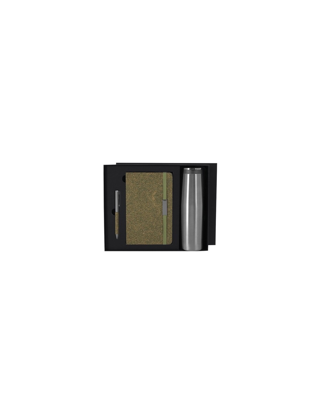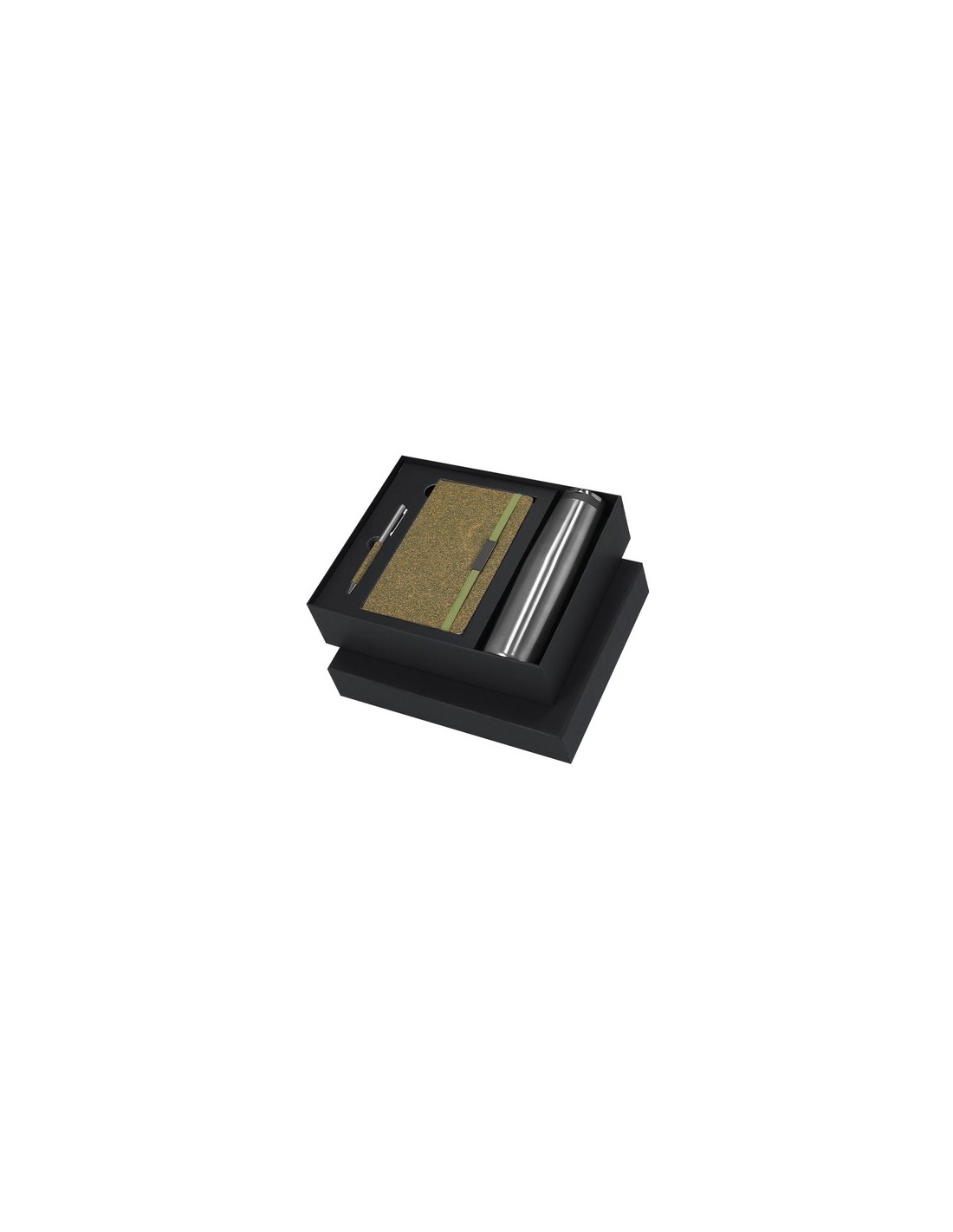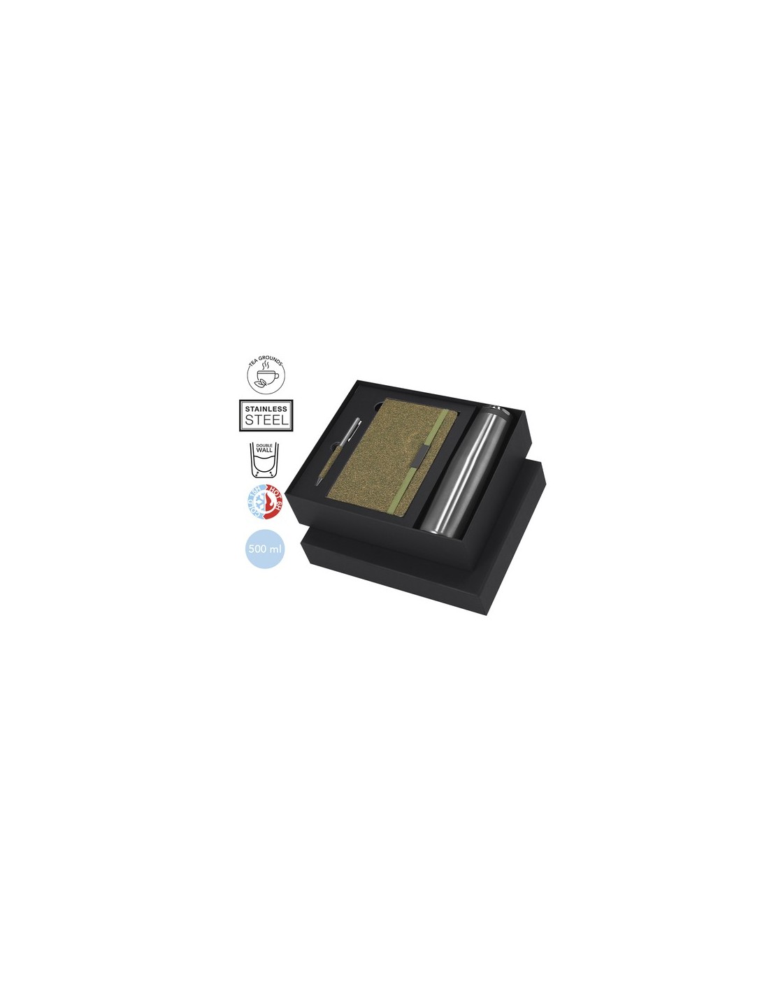 Set de bloc de notas y bolígrafo confeccionados con Fibra de Té, además de un bidón térmico fabricado en acero inox.El set incluye:- Bloc de notas de tapas rígidas, con 80 páginas rayas, banda elástica con clip metálico y marcapáginas a juego. - Bolígrafo de aluminio en acabado cromado con empuñadura de Fibra de Té, mecanismo giratorio y tinta azul. - Bidón térmico de doble pared fabricado en acero inox de 500ml. Con tapón a rosca y asa metálica. Bloc con logo Tea Grounds marcado en la parte posterior. Presentado de manera elegante en una caja negra con interior troquelado. Tea Grounds es un material sostenible creado a partir de residuos de hojas de té recicladas. Durante el procesamiento del té, se recolectan y compactan los restos para darles una segunda vida como recurso útil. Su producción fomenta la economía circular y reduce el impacto ambiental. Bidón Térmico Acero Inox, 500 ml. Bloc Fibra de Té, Portada Rígida, 80 Hojas. Bolígrafo Fibra de Té