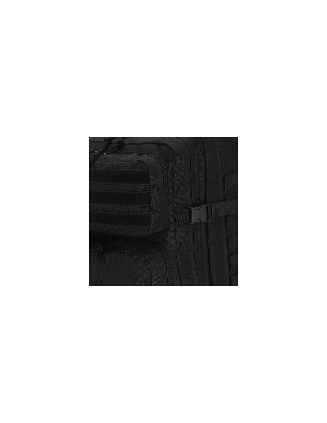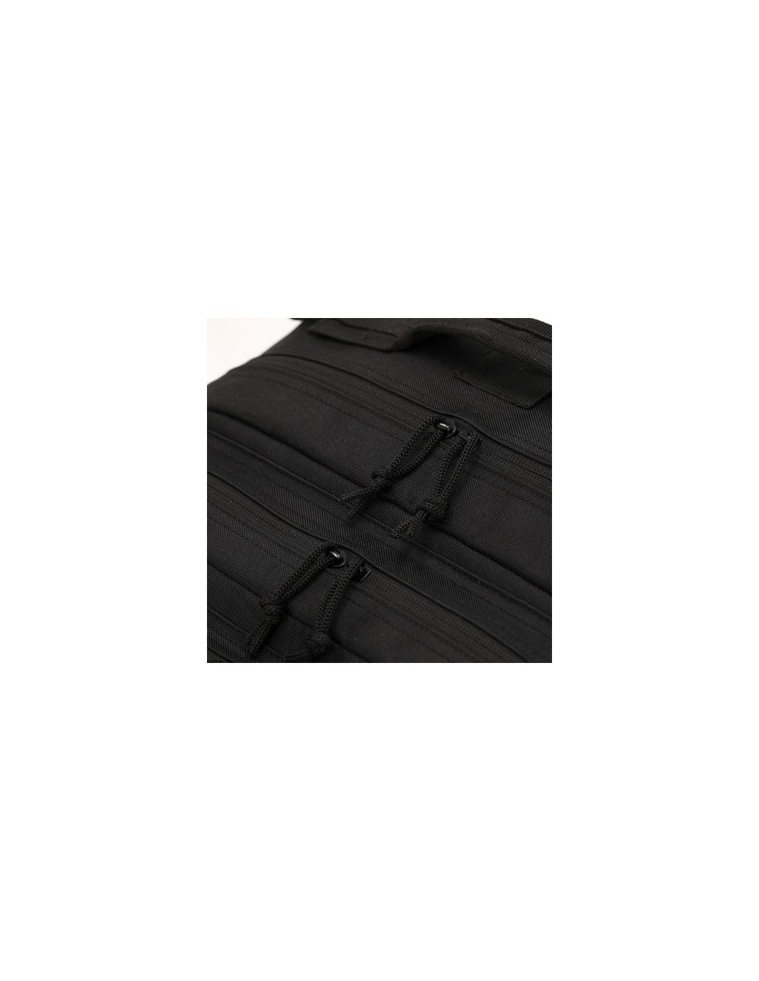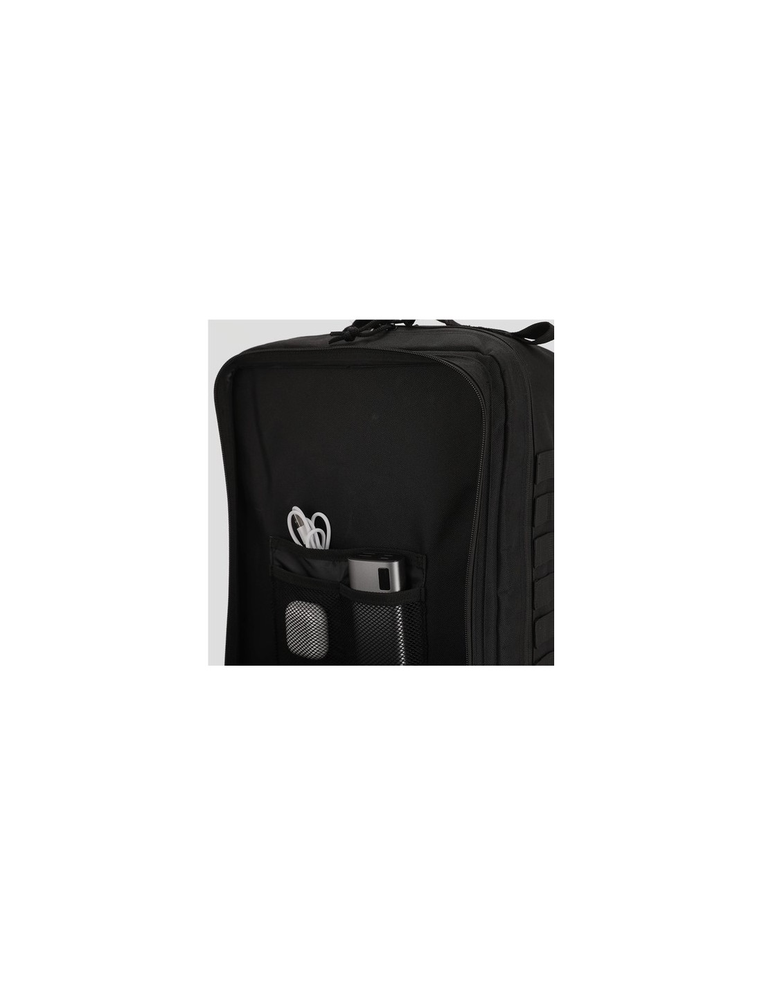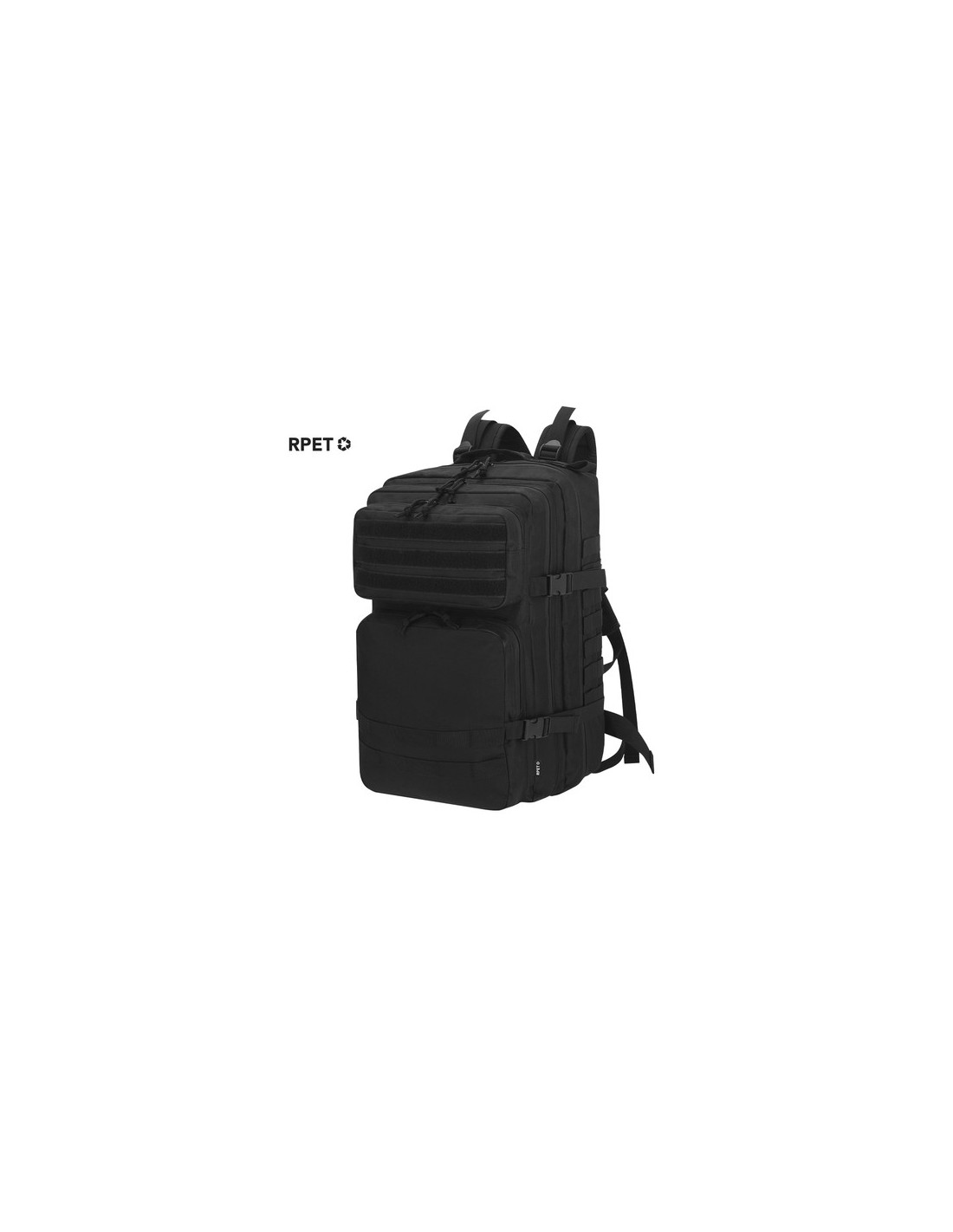 Mochila táctica en resistente poliéster RPET 600D. Parte frontal con múltiples bolsillos, además de soportes elásticos y velcros para colgar los accesorios necesarios durante la aventura. Compartimento principal con cierre de cremallera de doble tirador y bolsillos interiores con varios compartimentos, con capacidad para portátil de 17 pulgadas. Incluye esquinas reforzadas y asa de transporte. Con espalda y cintas de hombros acolchadas y ajustables, y correas frontales para mayor comodidad. Etiqueta con distintivo de RPET.El material RPET se elabora a partir de plástico reciclado, para así fomentar la reutilización de residuos plásticos y ayudar a la sostenibilidad del planeta. Parte Trasera y Cintas Acolchadas Composition : Poliéster 600D RPET.