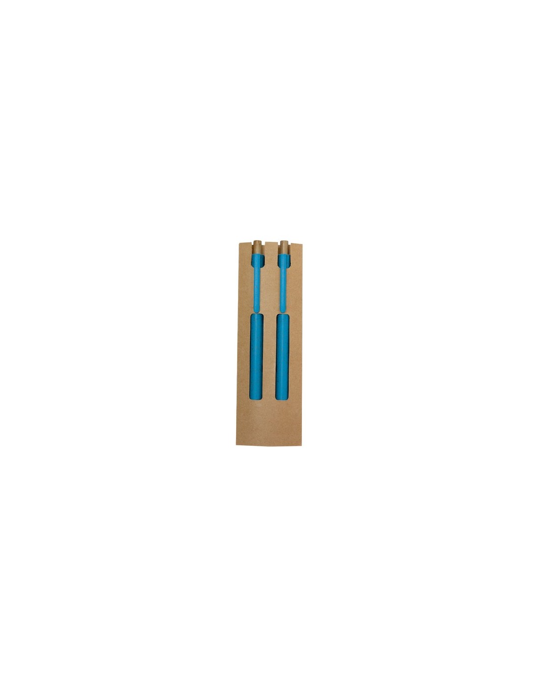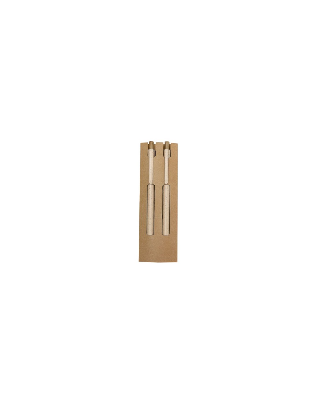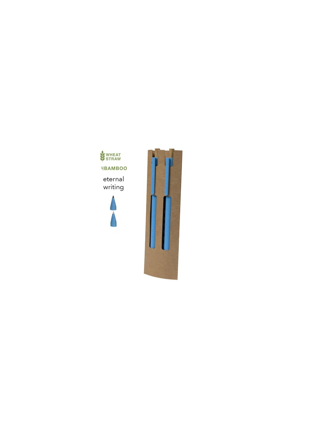 Set de bolígrafo y lápiz eterno fabricados en caña de trigo y bambú. Bolígrafo con mecanismo pulsador fabricado en bambú de tinta azul y clip a juego. Y lápiz con mecanismo pulsador fabricado en bambú con punta eterna, para así usar siempre el mismo lápiz y no generar residuos. Presentados en estuche de cartón reciclado. Con distintivo de caña de trigo impreso.Elaborado con elementos vegetales para así fomentar la utilización de materias primas naturales y reducir las emisiones contaminantes. Bolígrafo y Lápiz Eterno Composition : Caña de Trigo/ ABS/ Bambú.