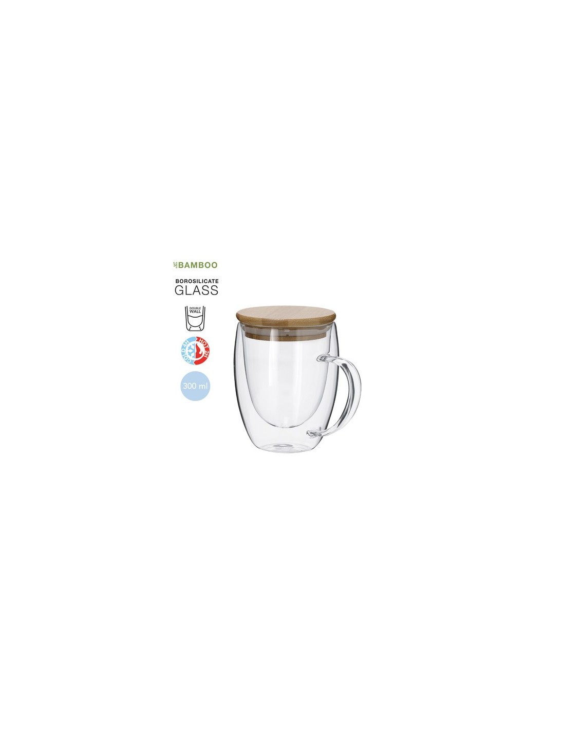 Taza térmica de doble pared y 300 ml de capacidad. Fabricada en cristal de borosilicato con tapa con sellado hermético de bambú.Fabricado en cristal de borosilicato, que ofrece una resistencia y durabilidad excepcionales, alargando su vida útil y pudiendo ser reutilizado infinidad de veces. 300 ml Composition : Cristal Borosilicato/ Bambú.