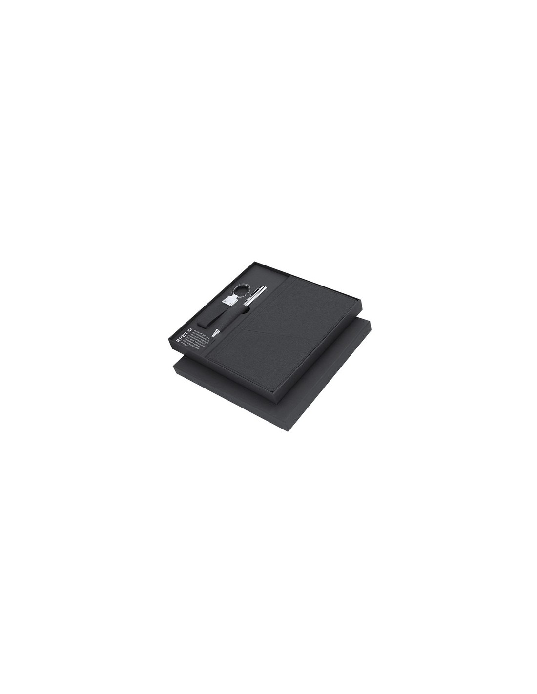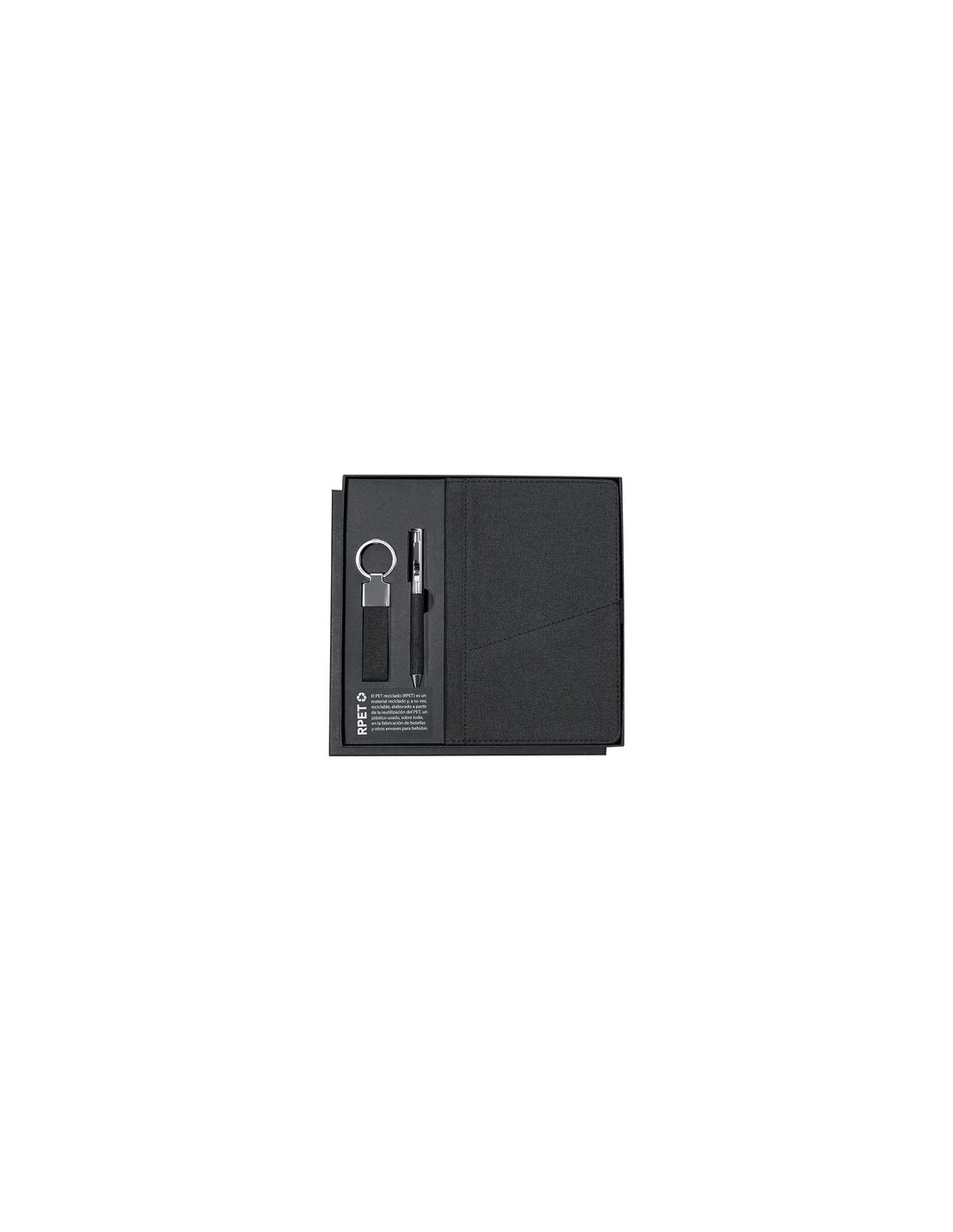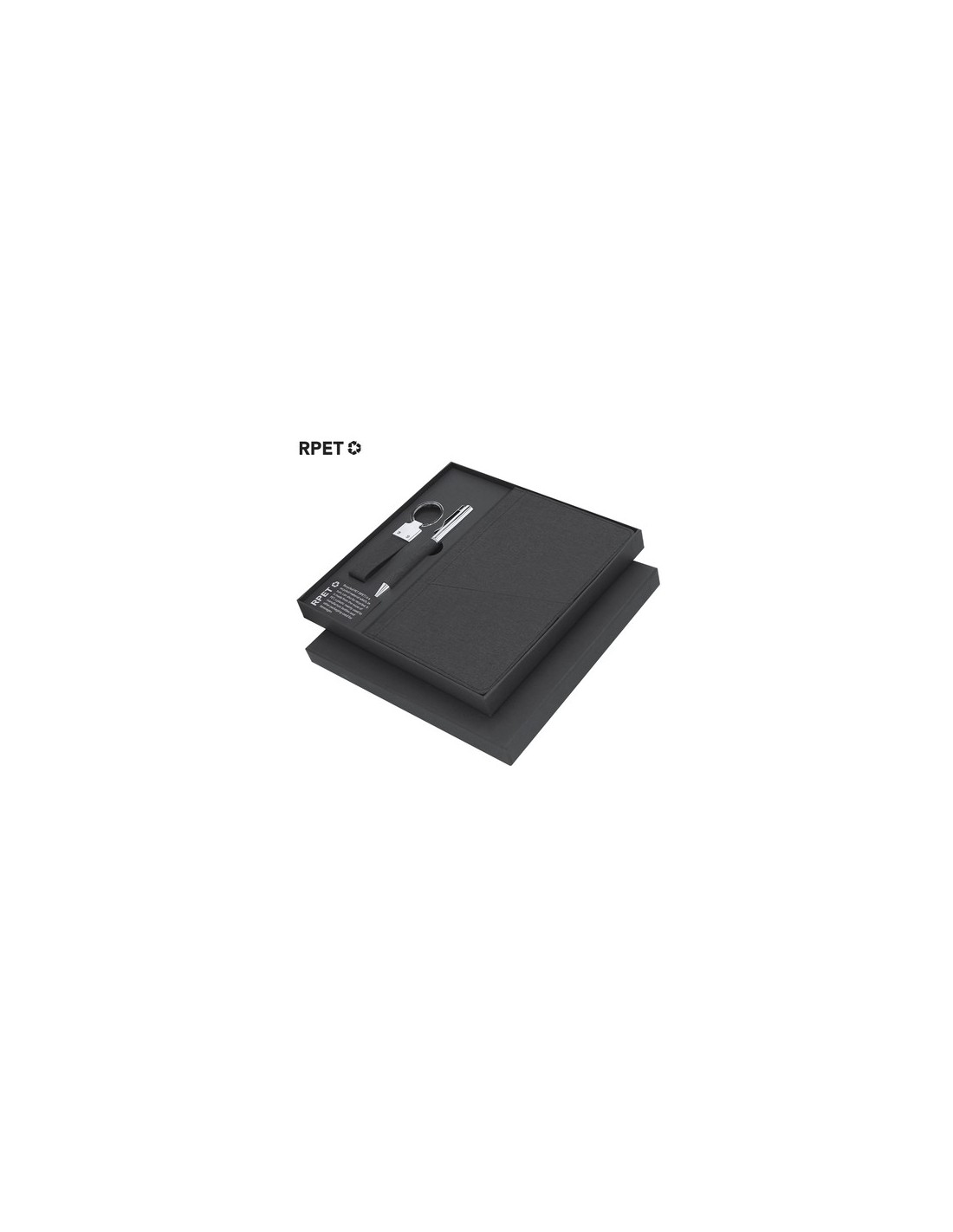 Elegante set premium que incluye:Bloc de notas en RPET en elegante color negro. Incluye cierre elástico, bolsillo frontal y marcapáginas de tela. Interior con 80 hojas de disposición a una raya. Bolígrafo en RPET de acabado negro mate, de mecanismo giratorio y tinta azul. Con clip y puntera en pulido metal.Elegante llavero con cinta fabricada en poliéster RPET 300D y accesorios cromados.Set presentado en estuche individual de acabado mate, con troquelado interior para cada uno de los elementos del set y tarjeta de RPET en el interior.El material RPET se elabora a partir de plástico reciclado, para así fomentar la reutilización de residuos plásticos y ayudar a la sostenibilidad del planeta. Bloc Portada Rígida. 80 Hojas. Bolígrafo. Llavero Composition : Poliéster 300D RPET/ Metal.