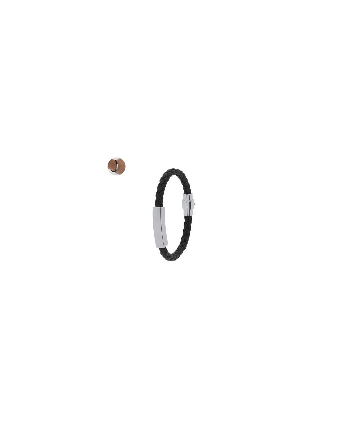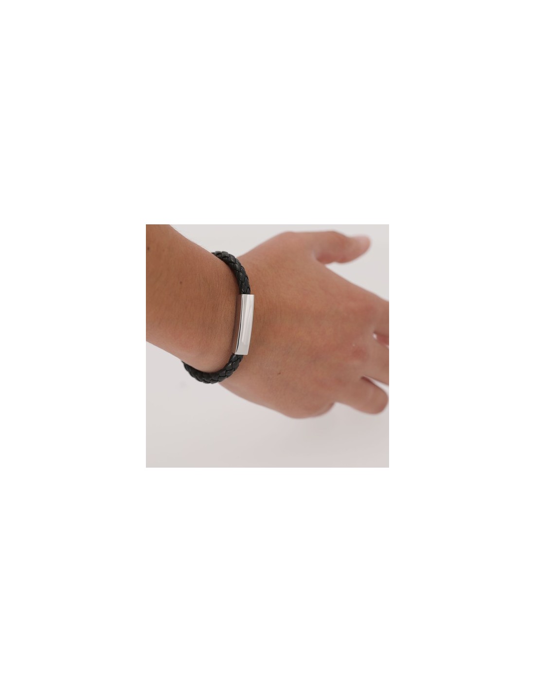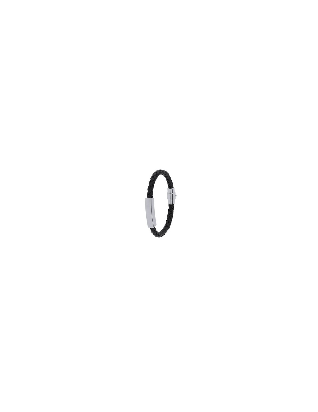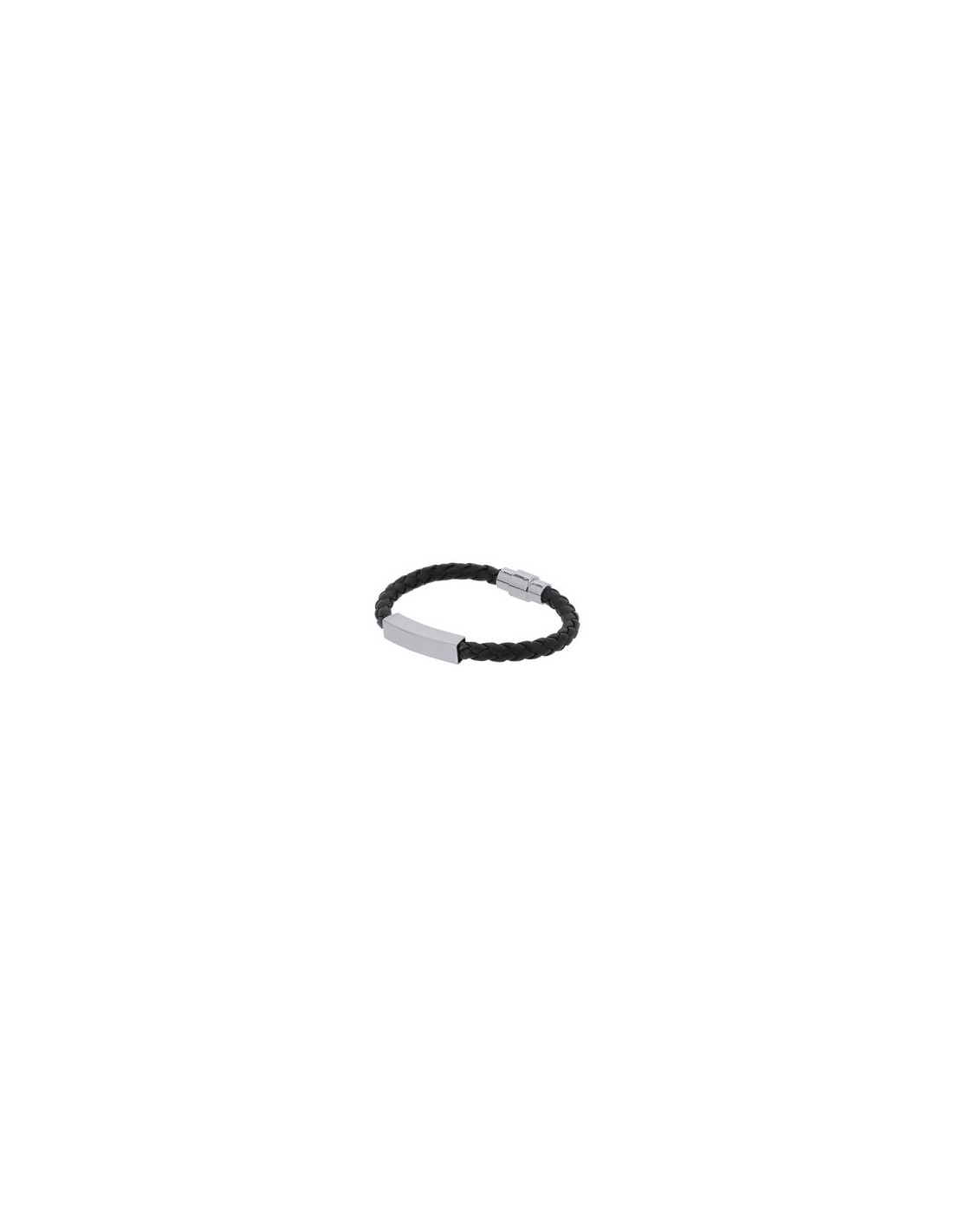Pulsera de piel sintética negra adornada con placa fabricada en acero inox pulido de diseño plano. Cuenta con un original cierre de seguridad magnético. Composition : Piel Sintética.