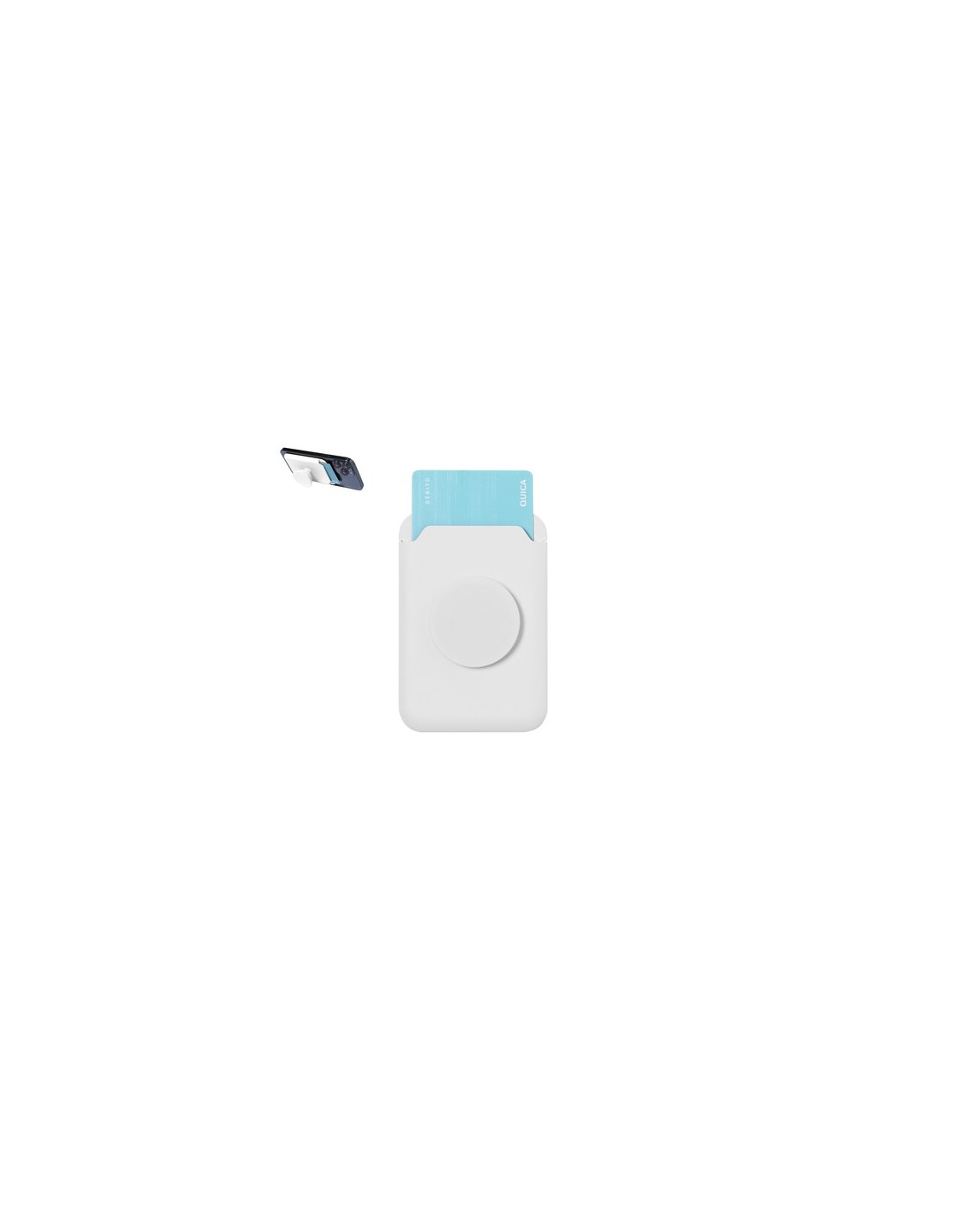 Tarjetero con soporte plegable para smartphone. Diseñado para guardar hasta dos tarjetas, incluye un aro metálico adhesivo para una sujeción y anilla extraible y ajustable para un mejor uso, en color abado brillo. Magnético