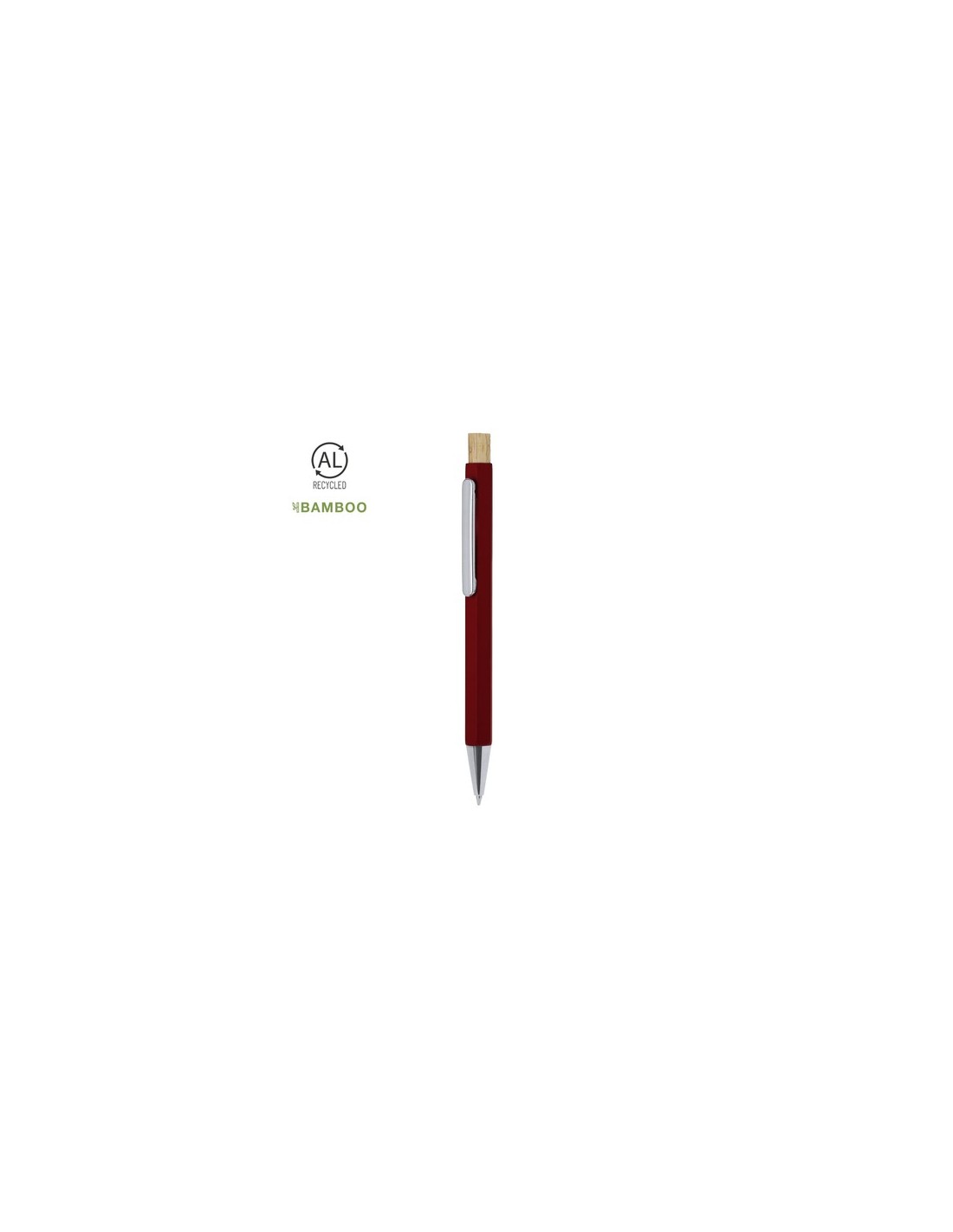 Elegante bolígrafo fabricado en Aluminio Reciclado. Cuerpo en distinguida forma hexagonal, con clip y punta cromadas. De mecanismo pulsador fabricado en bambú y de tinta azul. Con distinguido logo de Aluminio Reciclado marcado en la caña.El Aluminio Reciclado es un material con posibilidades de reciclaje casi infinitas, sin perder sus propiedades originales y consumiendo menos energía en este proceso.Certificación GRS (Global Recycled Standard / Estándar de Reciclaje Global), que garantiza el origen reciclado del material usado para fabricar el producto.Materiales como el bambú fomentan la utilización de materias primas naturales, reduciendo las emisiones contaminantes. Proviene de una planta de gran resistencia y versatilidad, con crecimiento y regeneración rápidos, siendo una excelente alternativa al uso de madera tradicional. Carga Jumbo Composition : Aluminio Reciclado.