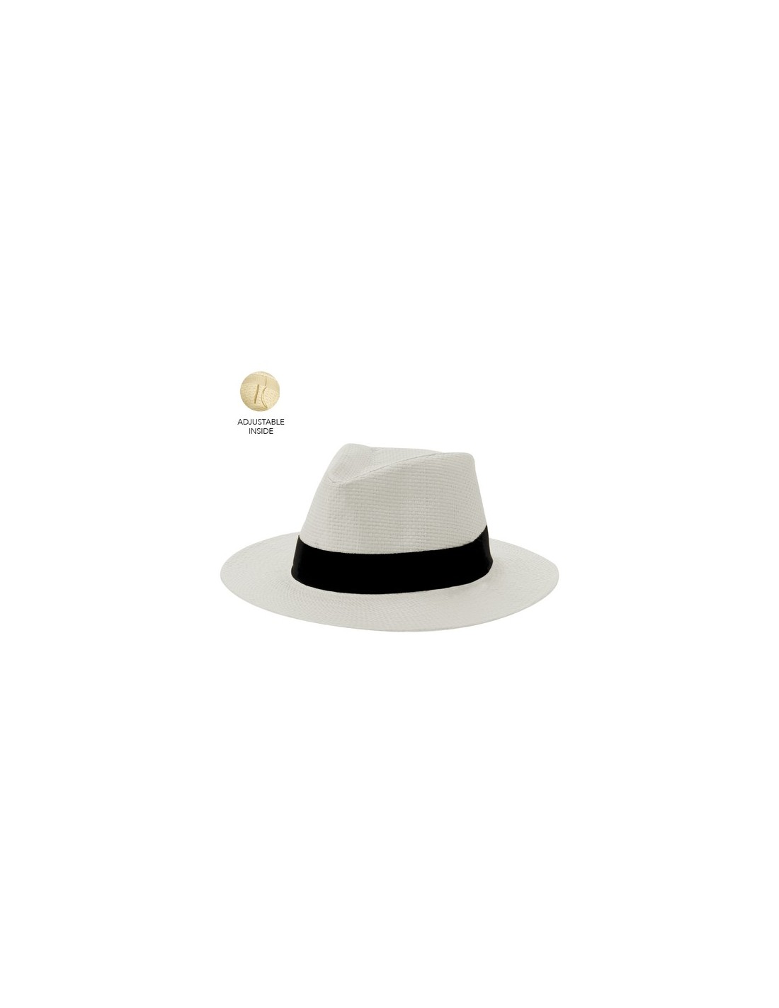 Sombrero de alta calidad confeccionado en paja de papel blanca, con cinta en la base de color negro. Ajustable desde el interior, con cinta exterior y confortable cinta interior. Ajustable Composition : Paja de Papel.