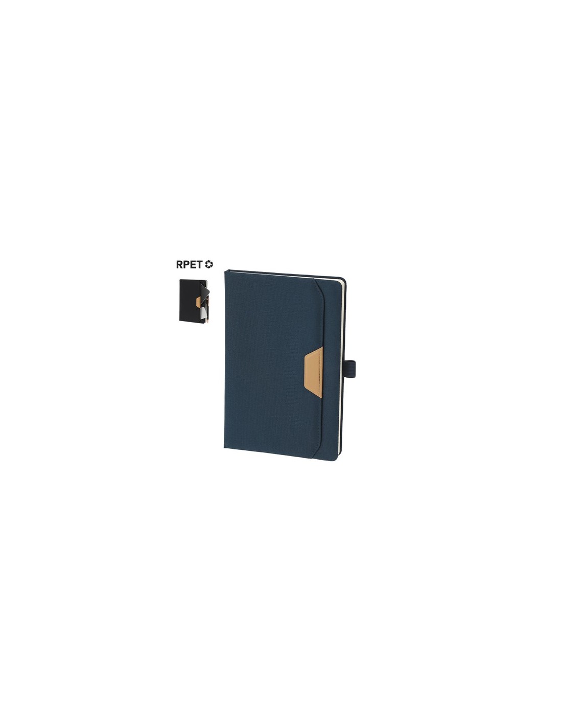 Bloc de notas en RPET, con un bolsillo exterior con distinguido detalle en PU marrón. Incluye 80 hojas de color crema a rayas y soporte elástico para bolígrafo a juego. Incluye distintivo RPET.El material RPET se elabora a partir de plástico reciclado, para así fomentar la reutilización de residuos plásticos y ayudar a la sostenibilidad del planeta. Portada Rígida. 80 Hojas Composition : Poliéster 600D RPET.