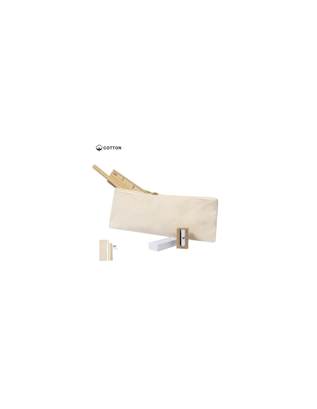 Set de 4 piezas presentado en estuche de algodón con cierre de cremallera. Incluye:- Lápiz de madera con cuerpo redondo de acabado natural y mina negra- Regla de 15cm con sistema métrico en centímetros/pulgadas- Goma de borrar- Sacapuntas 4 Piezas Composition : Algodón.
