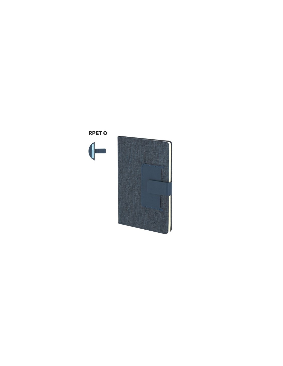 Bloc de notas de tapas rígidas en combinación del poliéster RPET 300D y PU. Incluye bolsillo de PU en portada, ideal para tarjetas. Con cierre magnético, 80 páginas de disposición a una raya y marcapáginas a juego.El material RPET se elabora a partir de plástico reciclado, para así fomentar la reutilización de residuos plásticos y ayudar a la sostenibilidad del planeta. Portada Rígida. 80 Hojas Composition : Poliéster 300D RPET/ PU.