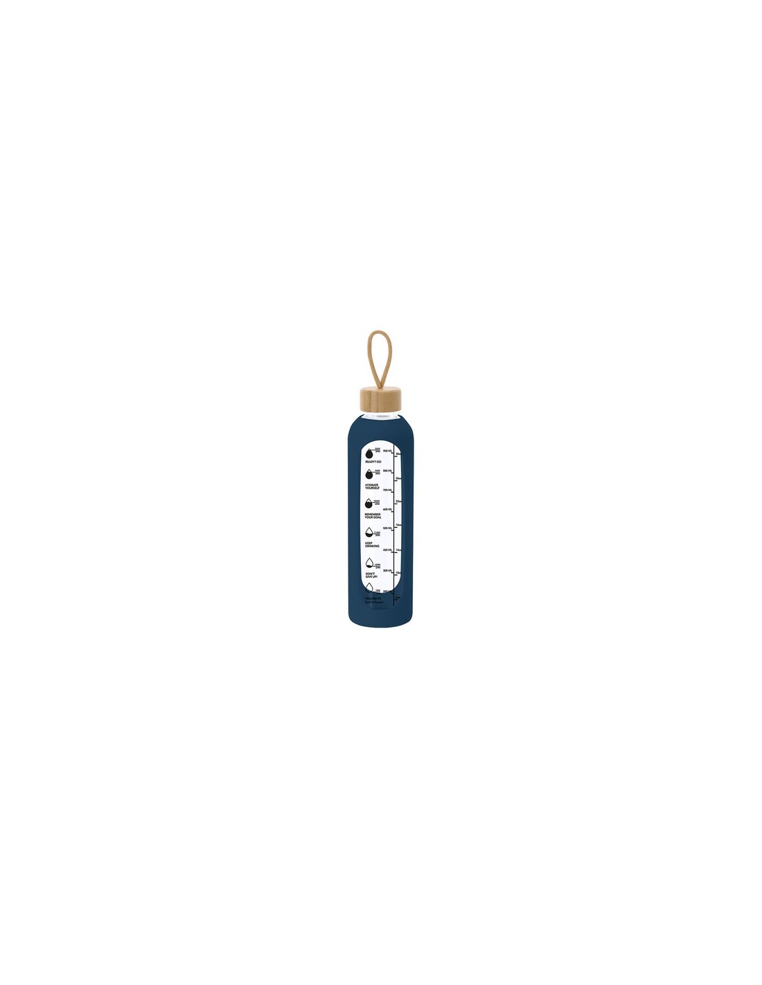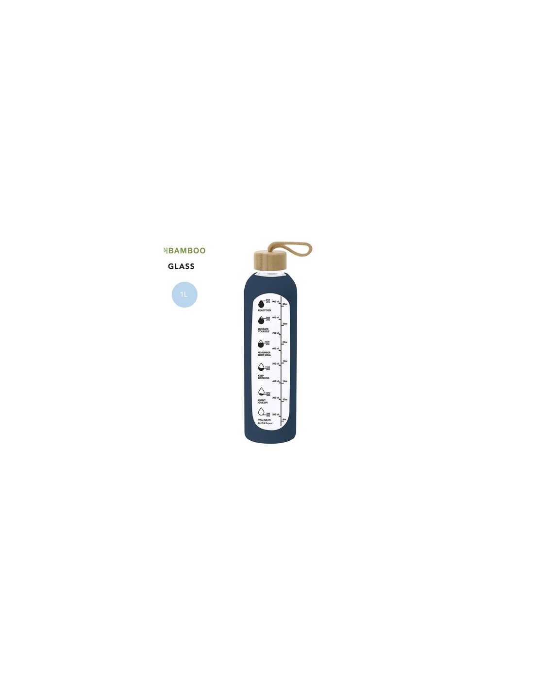 Bidón fabricado en cristal de 1L de capacidad, diseñado para fomentar una hidratación adecuada. Recubierto con funda de silicona que protege y proporciona un agarre cómodo y seguro.Incluye indicador de capacidad en litros y onzas, acompañado de frases motivadoras que inspiran a mantener una correcta hidratación diaria. Tapón, elaborado en bambú, incluye práctico cordón para facilitar su transporte. Libre de BPA. 1 L. Funda Silicona Composition : Cristal/ Bambú.