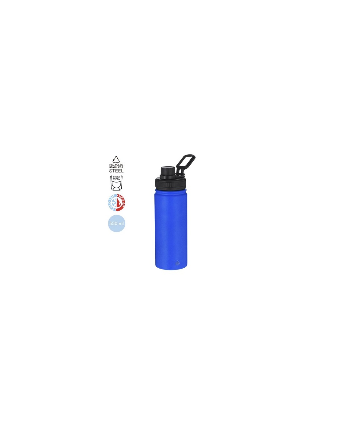 Bidón de Acero Inox Reciclado con 550 ml de capacidad. Incluye tapadera color negro con sistema de cierre a rosca, agarre de silicona para un óptimo sellado, dosificador y asa para transporte ajustable. En acabado mate especialmente diseñado para láser. Incluye distintivo Acero Inox Reciclado.El acero es uno de los materiales más demandados y que puede encontrarse casi en todas partes, desde productos de uso diario a grandes construcciones. Con innumerables propiedades, entre las que cabe destacar la durabilidad y su alto grado de reutilización, convirtiéndolo en una alternativa muy valorada en soluciones de sostenibilidad. Debidamente tratado, permite obtener nuevos recursos de infinita utilización. 550 ml Composition : Acero Inox Reciclado.