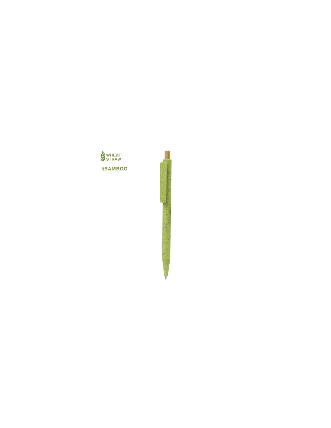 Bolígrafo fabricado con fibra de caña de trigo. Con cuerpo y clip a juego, de mecanismo pulsador fabricado en bambú y en tinta azul. Con distinguido logo de Caña de Trigo marcado en la caña. La Caña de Trigo fomenta la utilización de materias primas naturales, reduciendo así las emisiones contaminantes. Composition : Bambú/ Caña de Trigo/ ABS.