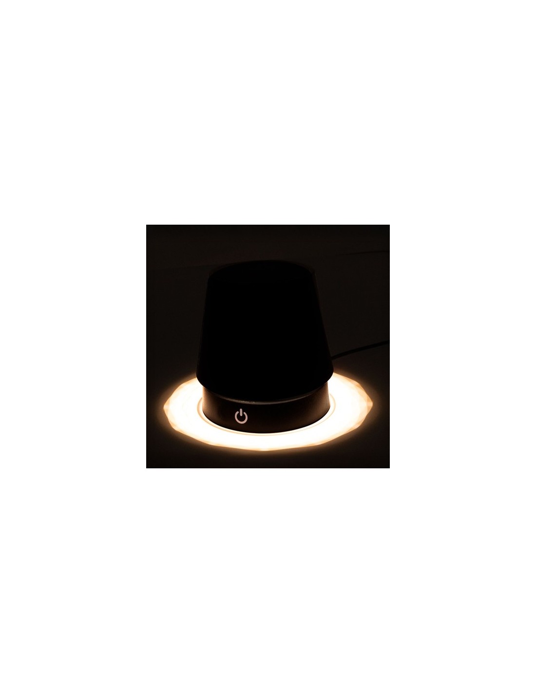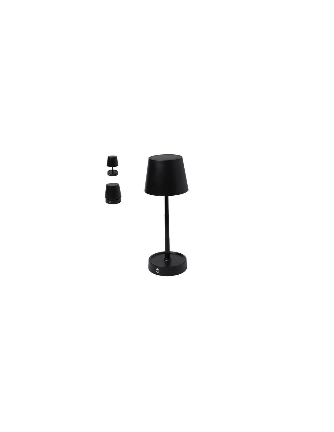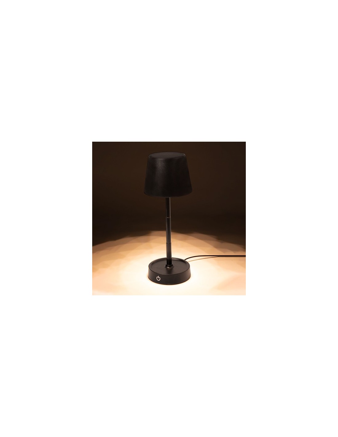 Lámpara de diseño en acabado negro mate. Incluye sistema de regulación de intensidad de luz táctil y con cuerpo plegable para ajustarlo en altura. Equipada con batería de 800mAh recargable por USB Tipo C -cable incluido- y 12 LEDs de luz cálida. Con botón encendido/apagado en la parte trasera. 12 Ledes. Plegable. Intensidad de Luz Regulable. Batería 800 mAh