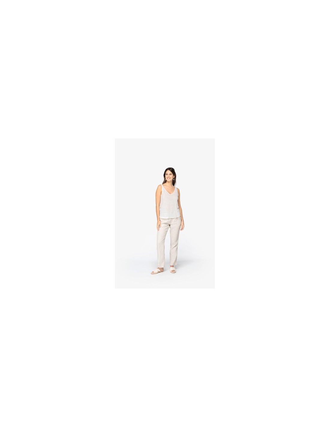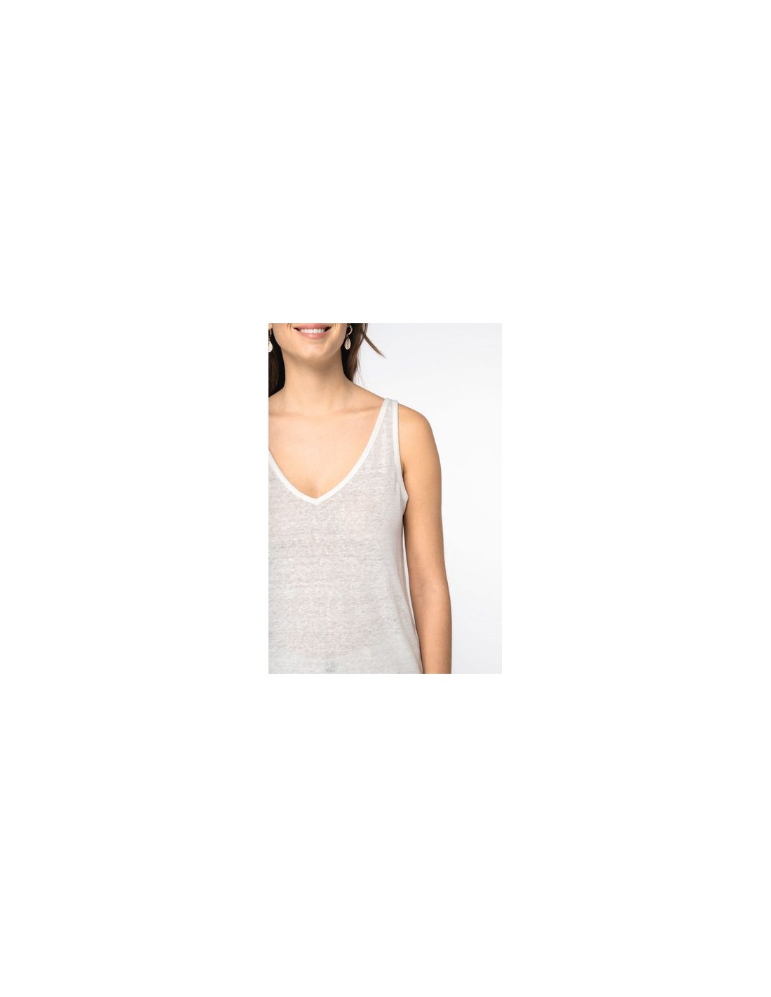 Tejido sostenible, termorregulador y ligero. No label para una personalización sin límites. Moderna y resistente. 100% lino. Tejido de punto. Corte ajustado. Cuello de pico en la parte delantera y trasera. Acabado del cuello y las sisas con ribete al bies en el tejido principal y costuras de refuerzo. Aberturas laterales. Pespunte simple en el bajo de la prenda. Certificaciones : EVE Vegan