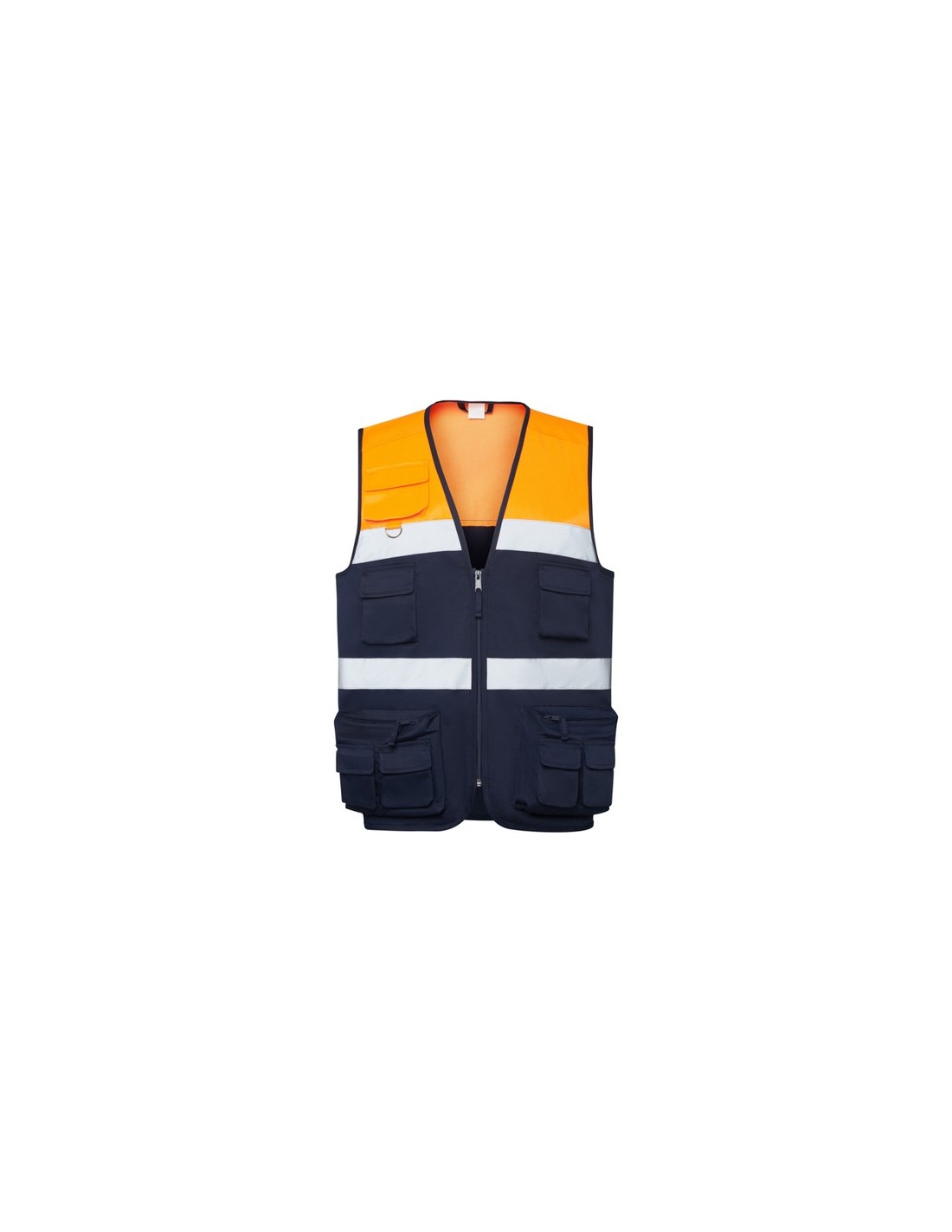 Chaleco multibolsillos de alta visibisidad.· Dos cintas reflectantes en pecho.· Escote en forma de pico y cremallera de Nylon.· Bolsillo superior en pecho derecho, con argolla metálica. · Dos bolsillos en pecho con fuelle, tapeta y cierre de velcro. · Dos bolsillos laterales con fuelle y cierre de cremallera con dos bolsillos superpuestos con tapeta y cierre de velcro. · Dos cintas reflectantes traseras en cintura y espalda. · Dos bolsillos en la parte trasera con tapeta y velcro.· Modelo Ribeteado con bies. Certificación CE según las normas:EN ISO 13688:2013/A1:2021EN 17353:2020Clase B3* Etiqueta Removible Composition : Tejido principal: 65% poliéster / 35% algodón, sarga de 200g/m²Tejido HV: 50% Poliéster / 50% algodón, sarga de 250 g/m²