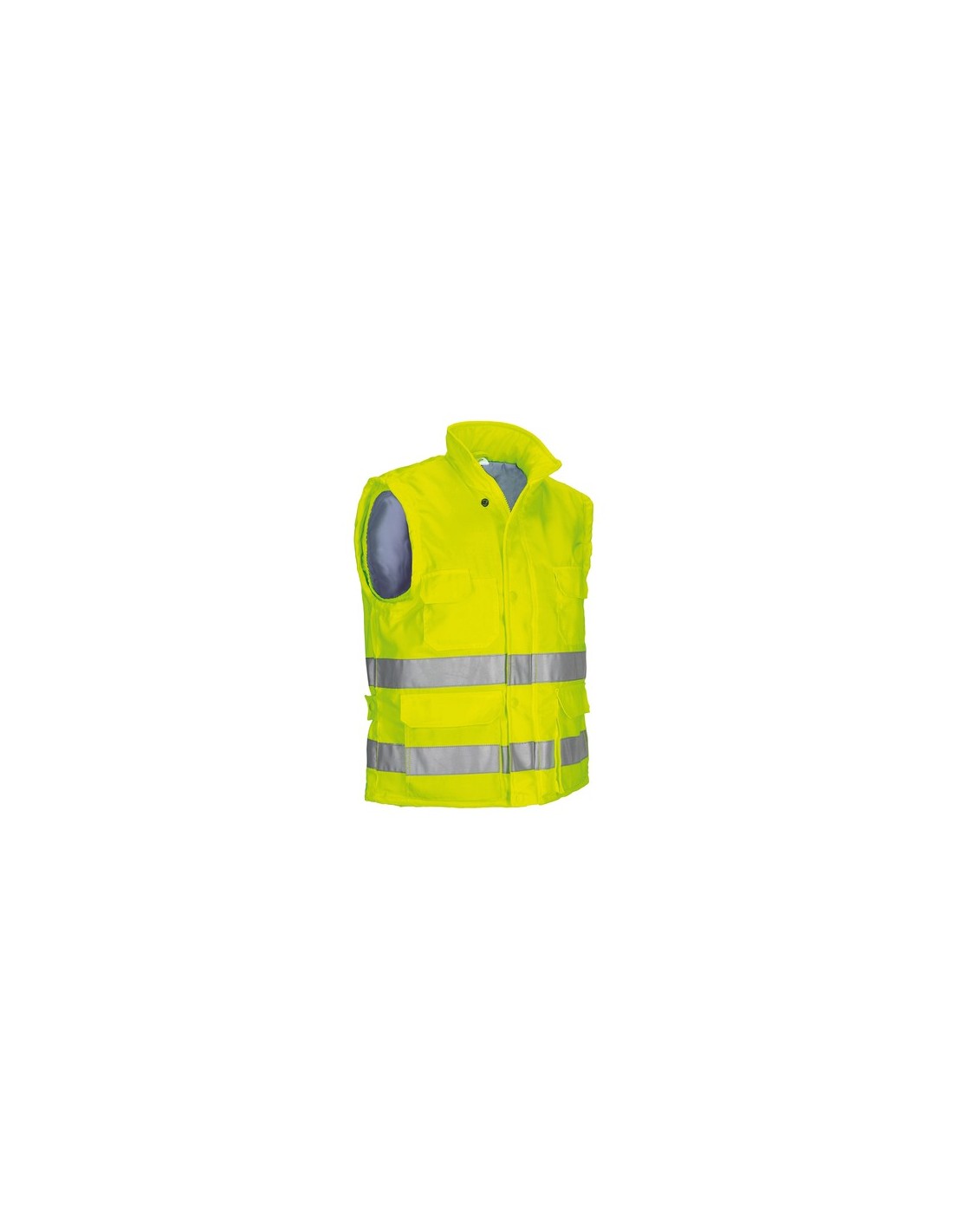 Chaleco acolchado de Alta Visibilidad.Confeccionado en tejido sarga exterior 100% poliéster con tacto algodón, suave y agradable, forro de tafetán y relleno acolchado que aporta retención térmica, incluye dos cintas retro-reflectantes cosidas en torso y espalda para mayor seguridad. Prenda certificada como EPI de Categoría II de Alta Visibilidad en base a las normas 13688 y 20471, clase 1, con duración máxima de 50 lavados.Cuello alto con cierre de cremallera entera, tapeta y botones a presión para mayor calidez y confort, cortavientos elástico en sisas para un mejor ajuste, cintura recta y faldón trasero que cubre la zona lumbar.Dos bolsillos inferiores con fuelle, dos superiores, todos con tapeta y velcro, un compartimento para bolígrafo y un bolsillo interior con velcro para tener todo accesible y disponible.Incluye cremallera interior trasera para facilitar los diferentes tipos de marcaje: serigrafía, transfer, vinilo, bordados, cosidos.Ideal como ropa laboral y uniformes de trabajo. Composición : exterior: 100% poliester - interior: 100% poliester