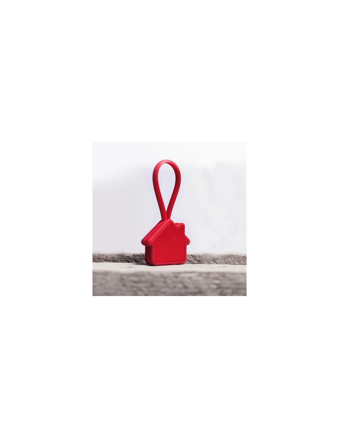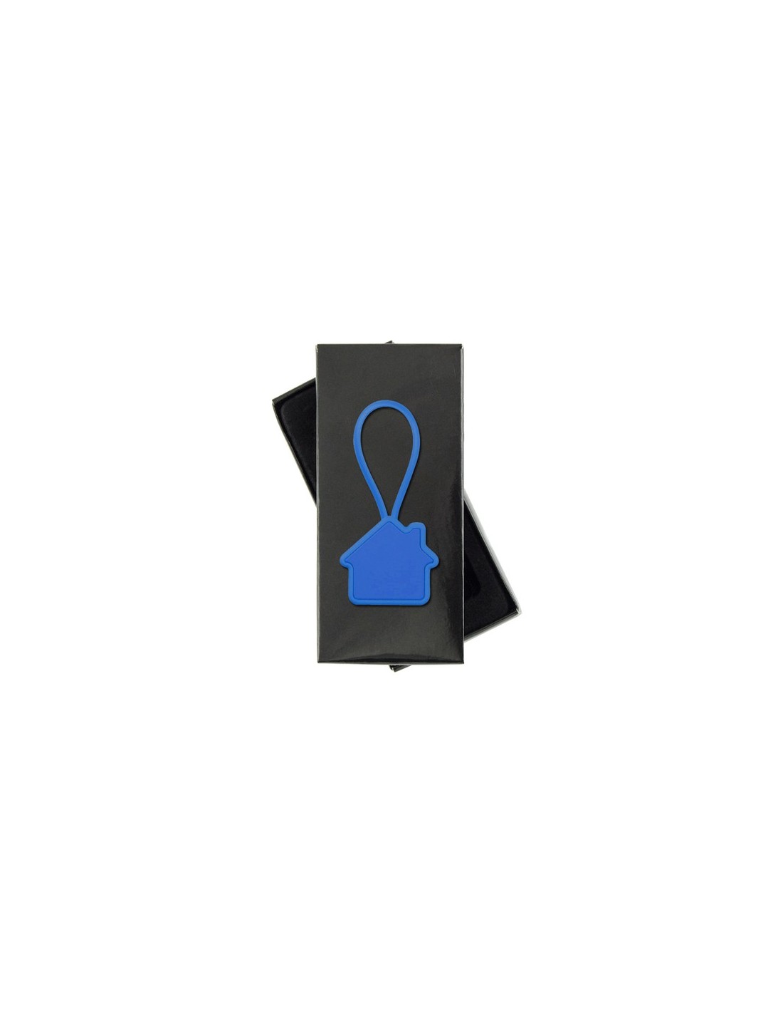 Llavero de aluminio en forma de casa. Acabado de bordes y sirga para colgar llaves en silicona. Presentado en caja de cartón negra. Material : Aluminio