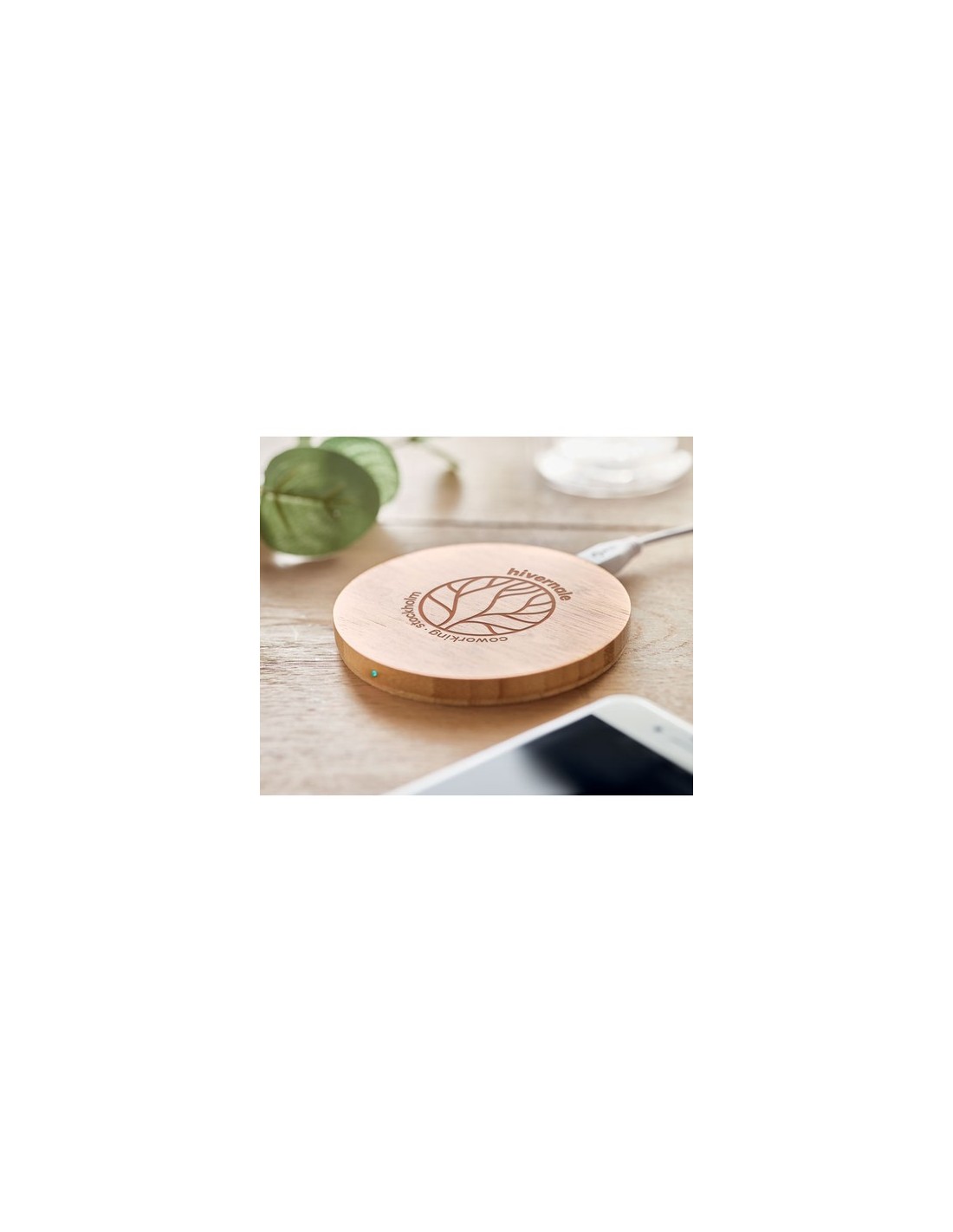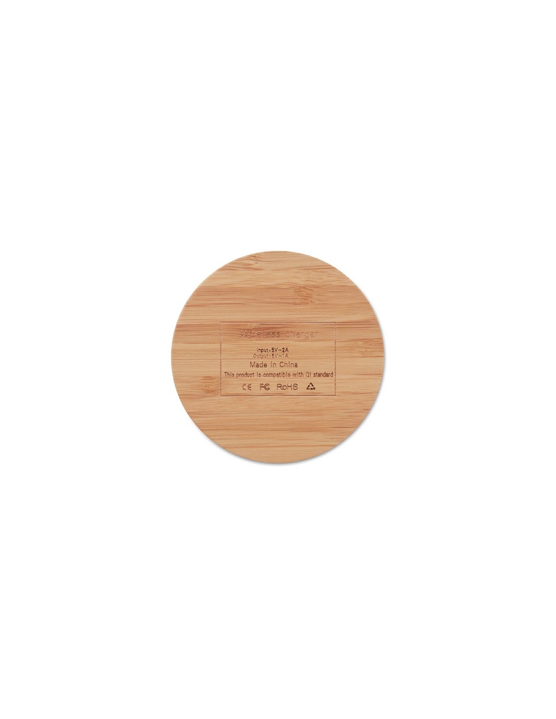 Cargador inalámbrico de bambú. Conecte el dispositivo a su ordenador, coloque su teléfono encima y deje que se cargue. Durante la carga se enciende la luz azul. Output: DC5V/1A (5W). Compatible con todos los dispositivos dotados de tecnología Qi, como los últimos Android, iPhone® 8, X y más recientes. El bambú es un material natural, el color del articulo, la medida y la impresión sobre el puede variar.