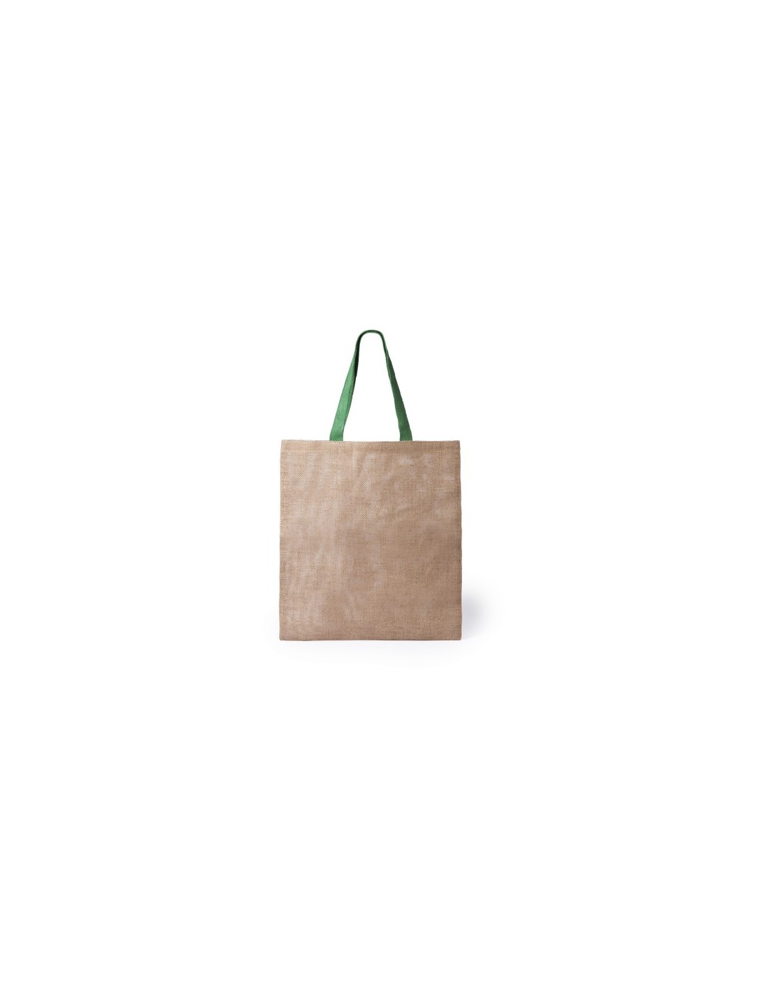 Bolsa ecológica de yute con cuerpo en color natural y asas medianas de 52cm en color verde. De acabado cosido y resistencia hasta 9kg de peso. Composition : Yute/ Algodón.