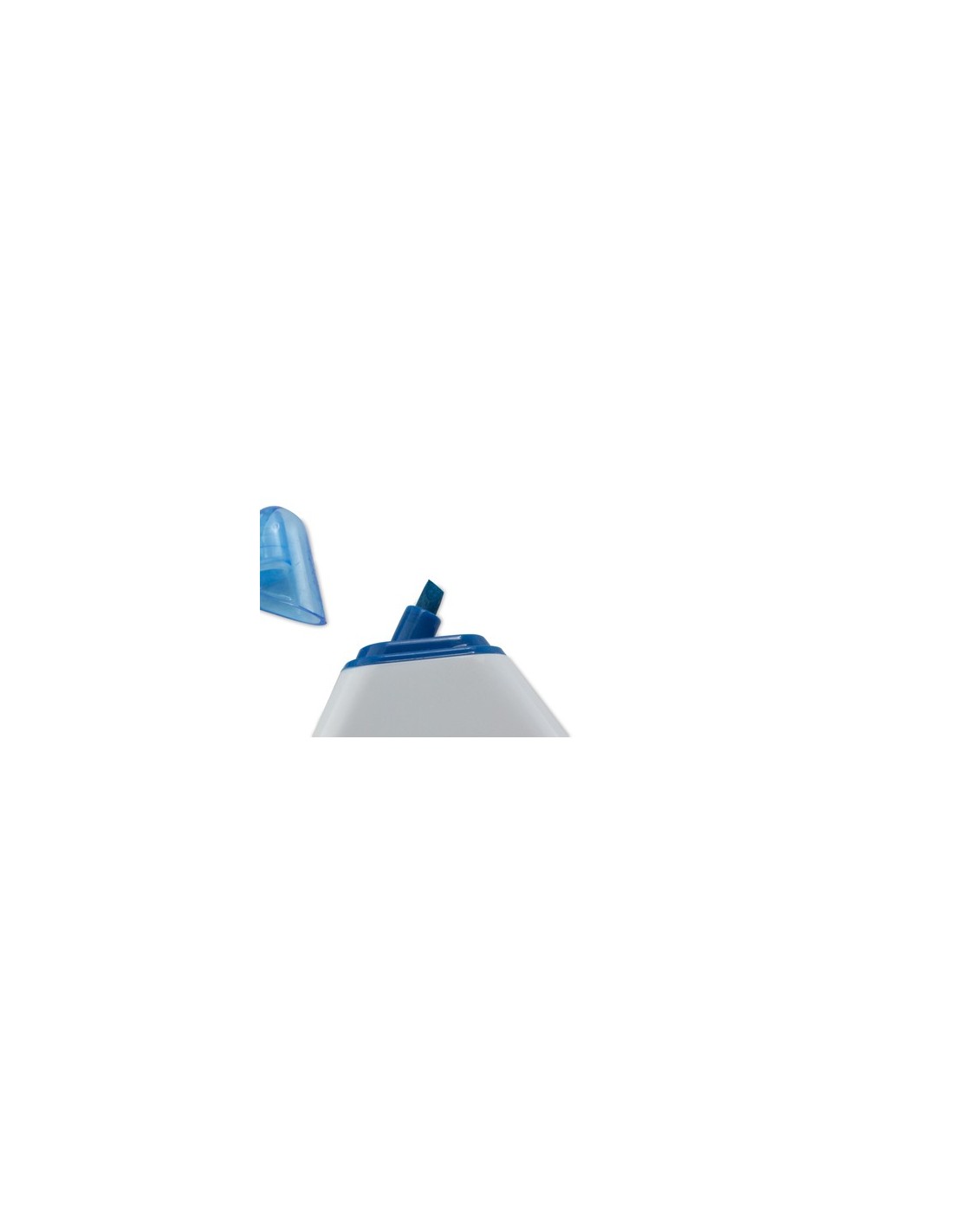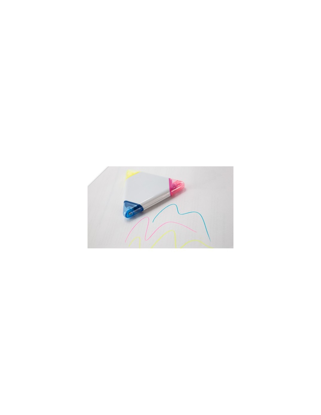 Original marcador fluorescente de tres colores con cuerpo triangular en suave acabado brillante de color blanco, especialmente diseñado para marcaje digital a todo color. Con capuchas translúcidas juego con marcador. Escritura 3 Colores