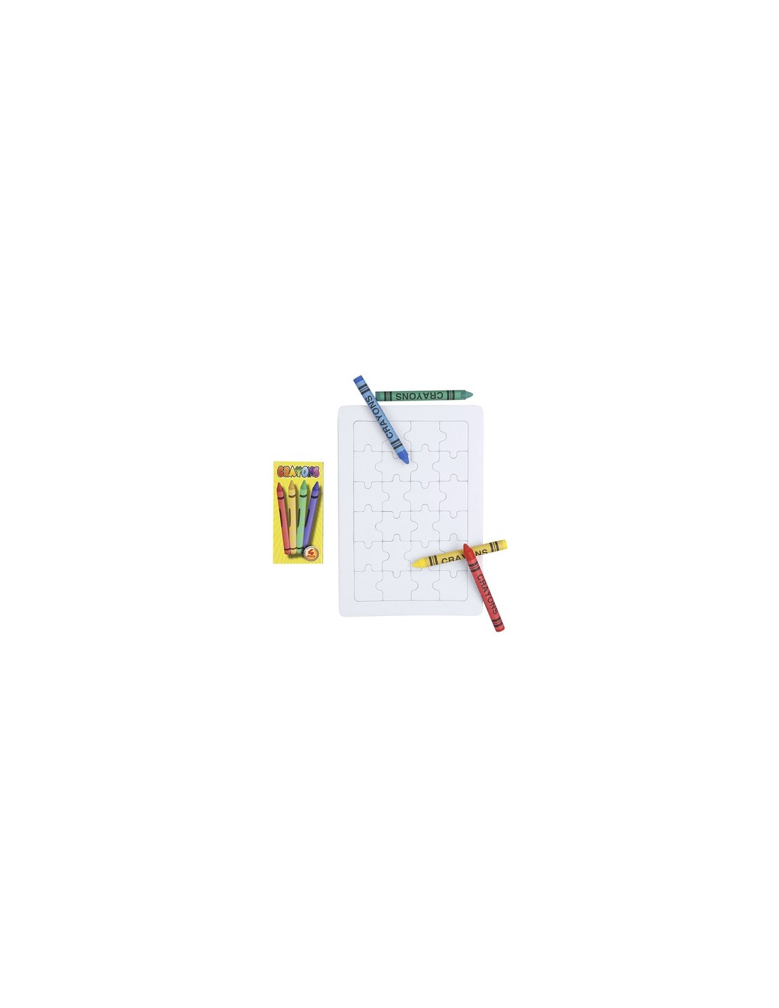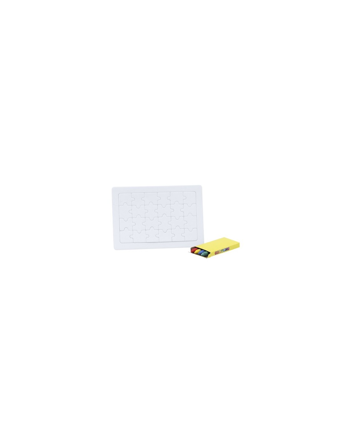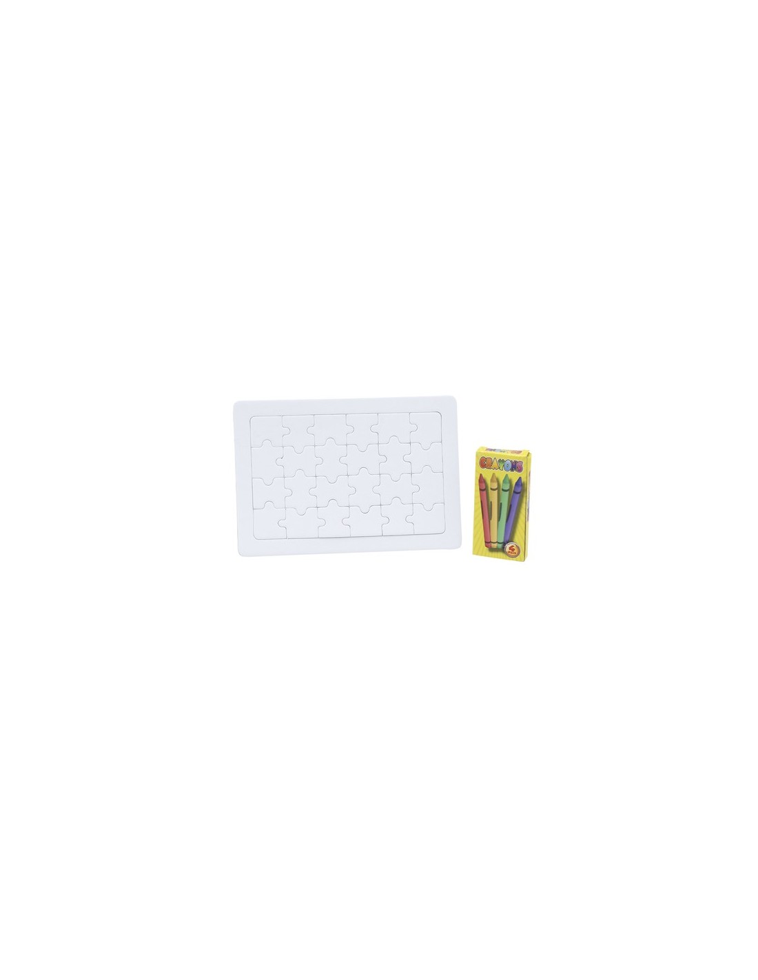 Divertido puzzle de 24 piezas en color blanco. Con caja de 4 ceras en colores amarillo, verde, azul y rojo incluida. 24 Piezas. 4 Ceras Incluidas Composition : Cartón.