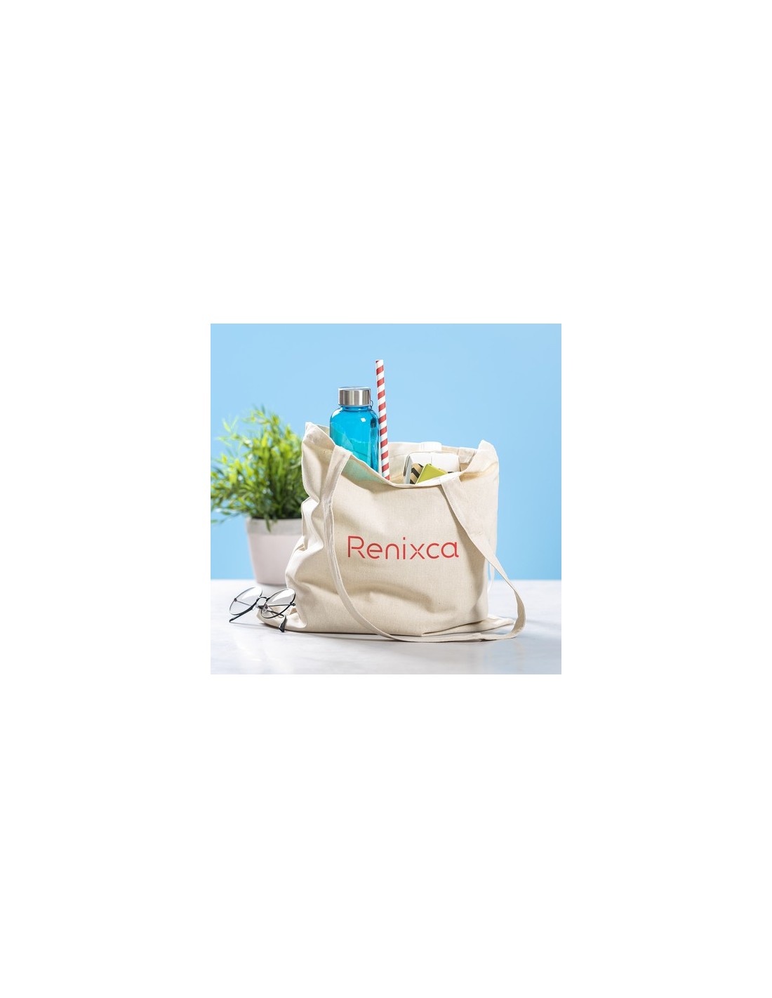 Bolsa en material 100% algodón con acabado en color natural. Con asas largas de 70cm y acabado cosido. Resistencia hasta 7kg de peso. Composition : 100% Algodón 105 g/ m2.