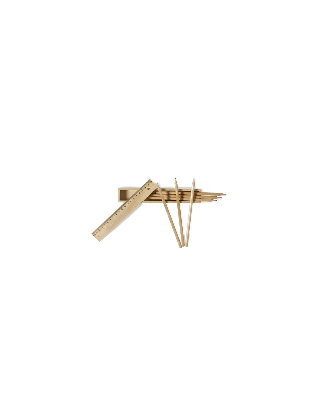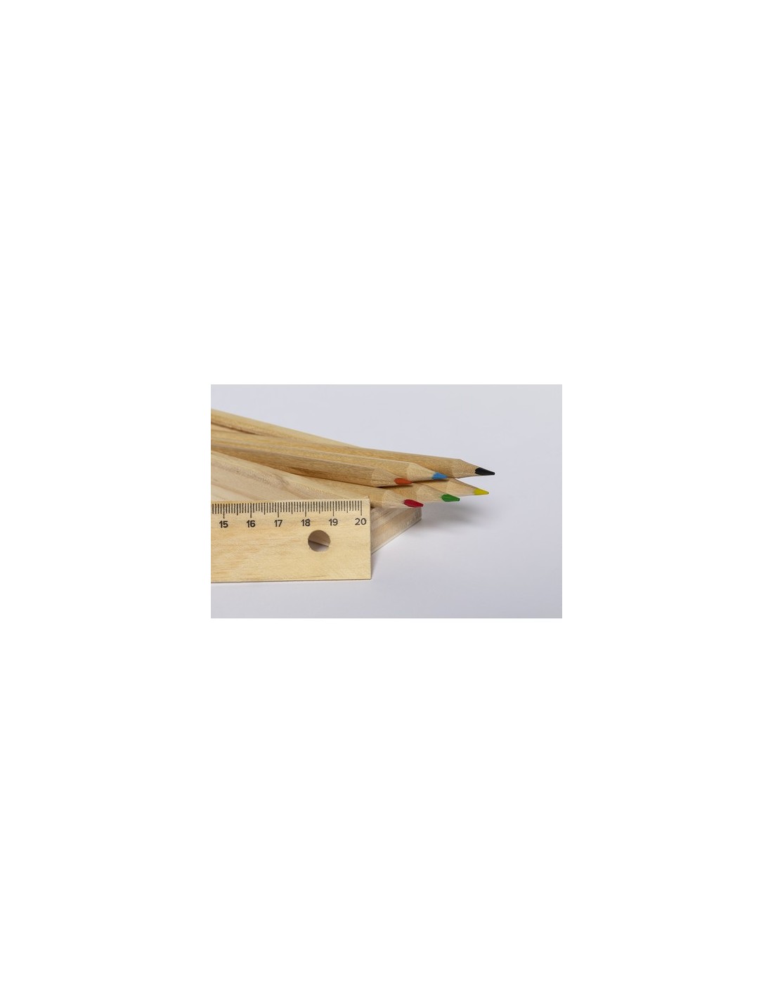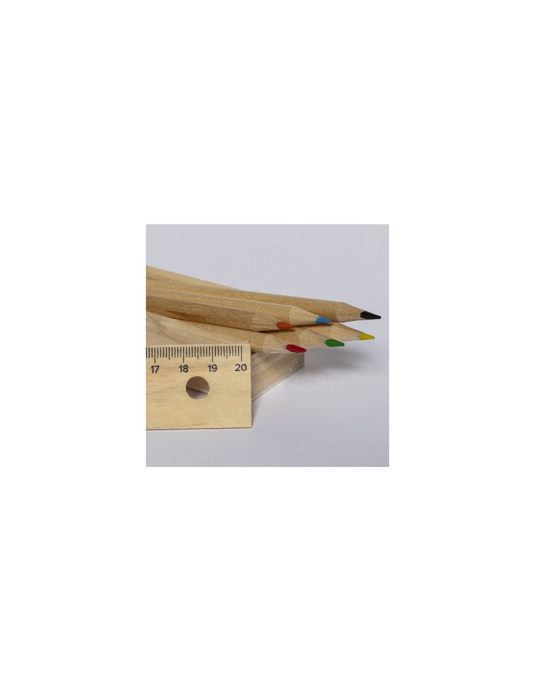 Set de 6 lápices en estuche de madera natural. Lápices en madera, con cuerpo redondo de acabado natural y minas en colores variada gama de vivos colores. Tapa de cierre anti deslizante con regla integrada de 20cm. 6 Lápices Composition : Madera.