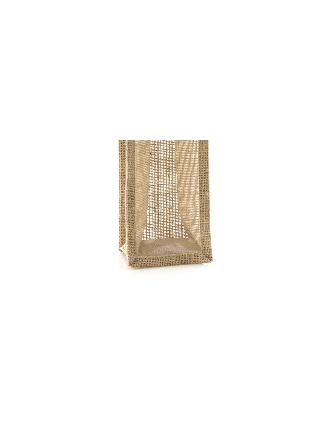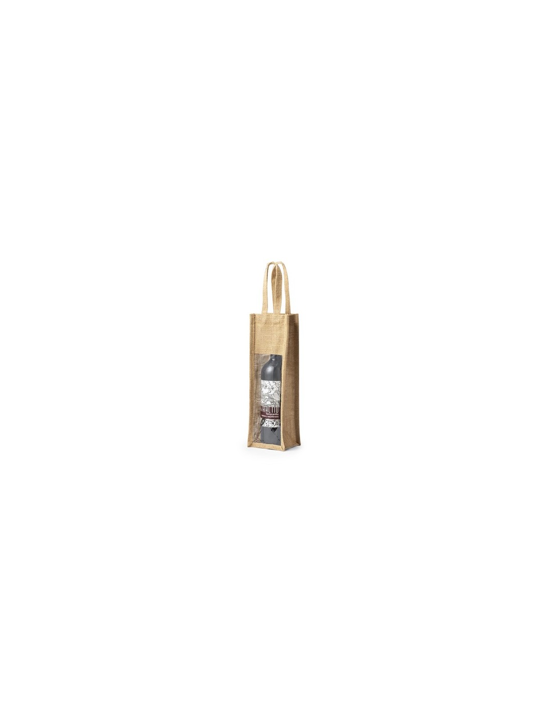 Resistente bolsa de yute laminado para botella de vino de 75cl. Con ventana transparente, ribetes y asas reforzadas. Composition : Yute Laminado.