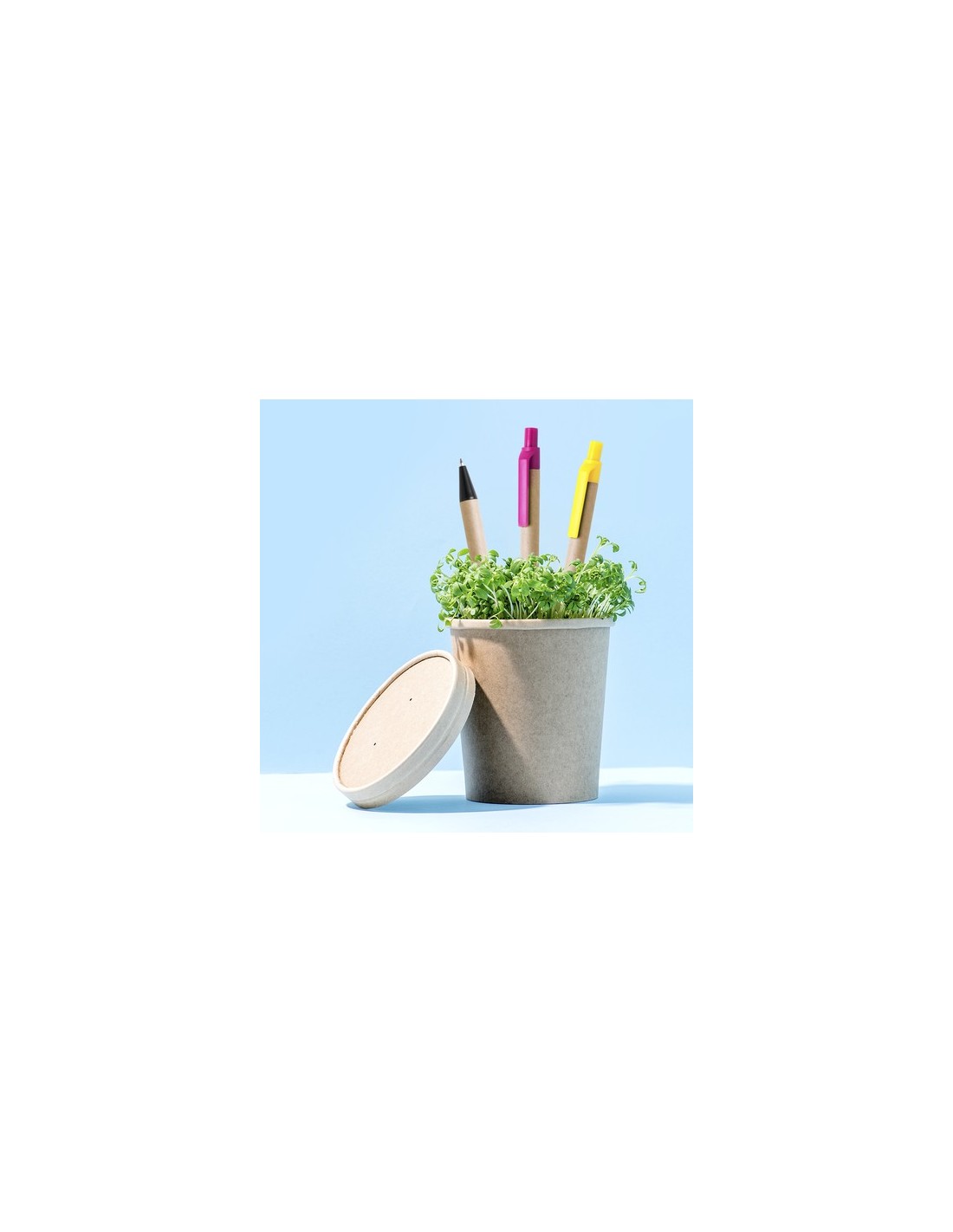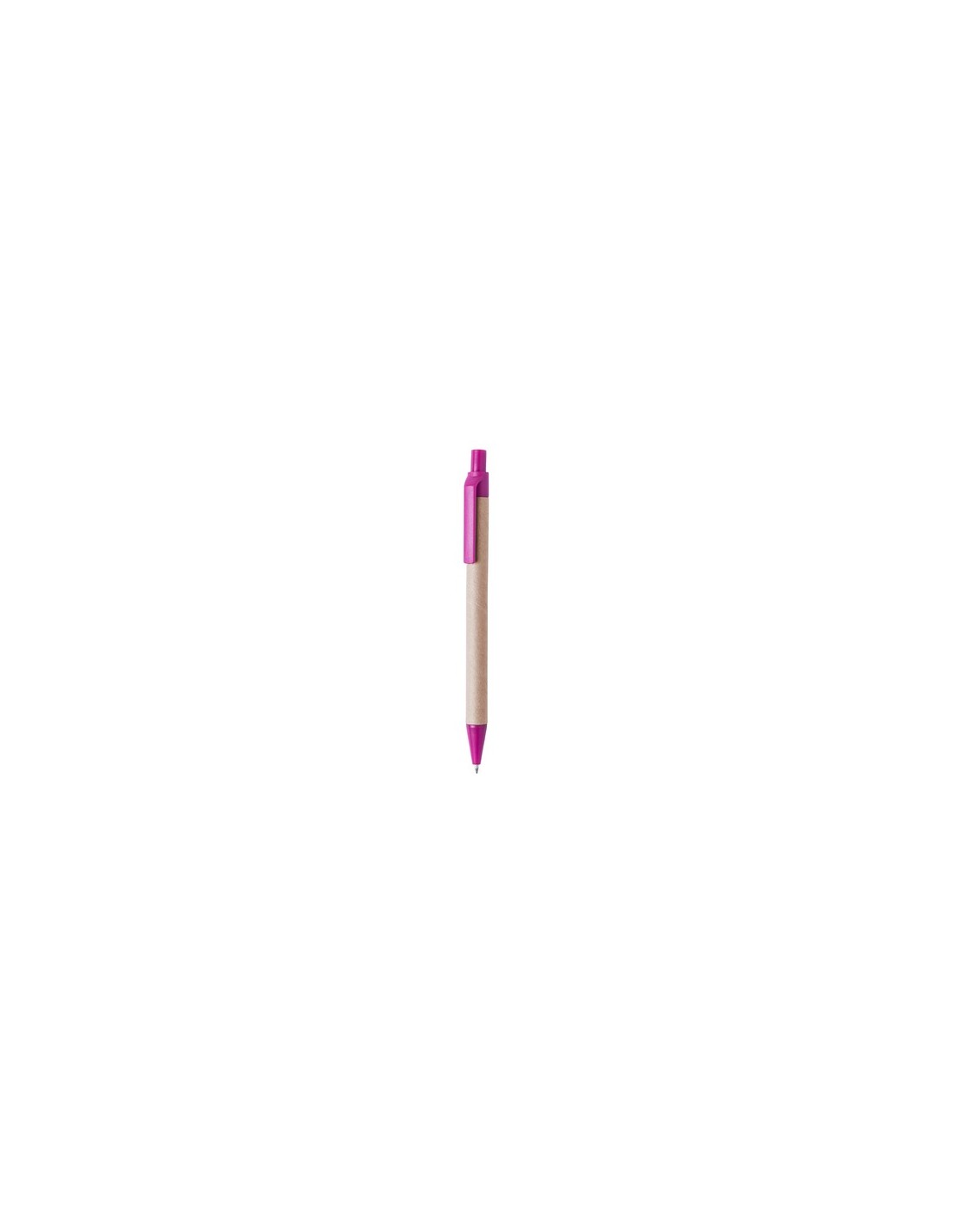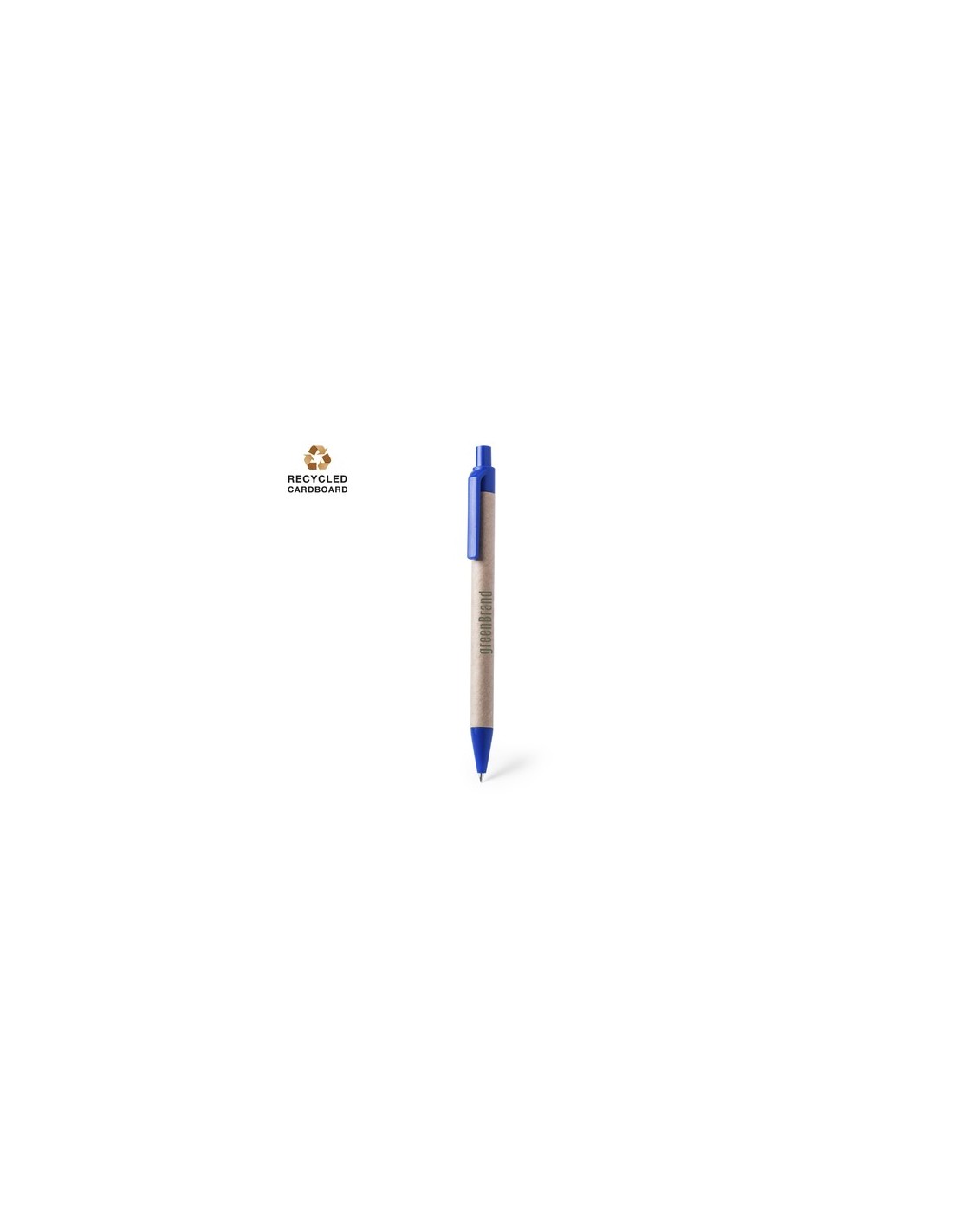 Bolígrafo de mecanismo pulsador en original combinación de cuerpo en cartón reciclado de color natural y accesorios en vivos colores. Tinta azul. Composition : Cartón Reciclado.